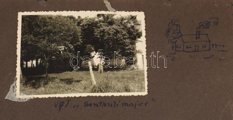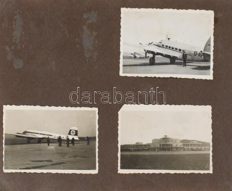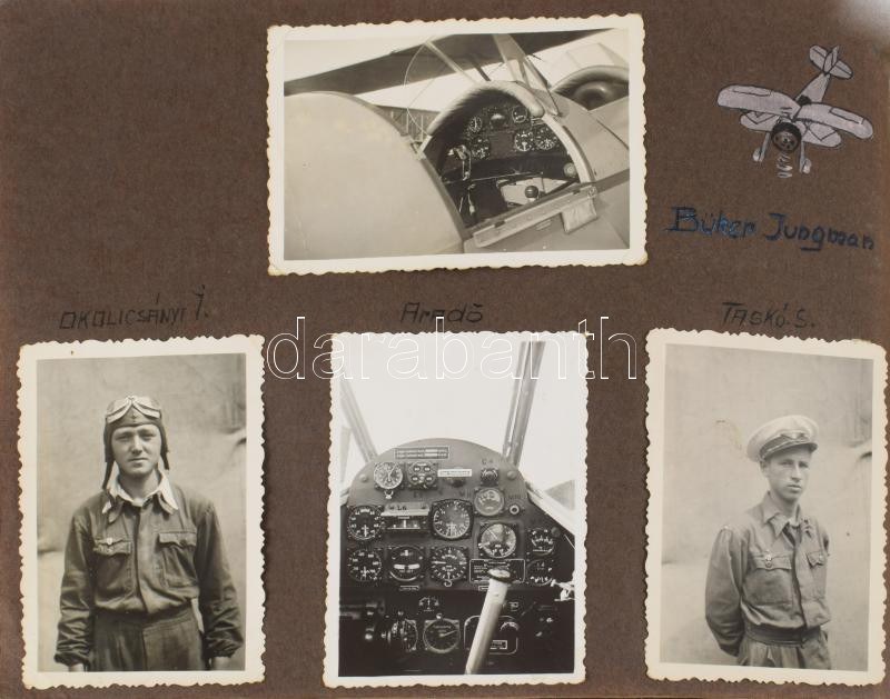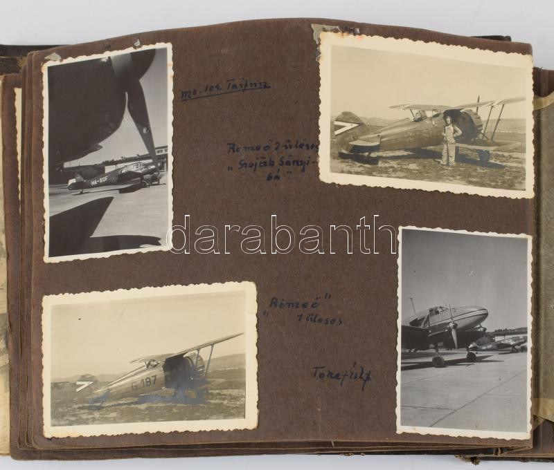 ca 1940 M. kir. Repülőoktató katonatiszt fotóalbuma 58 db a katonasághoz, budaörsi reptérhez kötődő, magyar légierő pilótáit, repülőgépeket ábrázoló feliratozott fénykép albumban, valamint további kb 60 családi fénykép, melyek között szintén vannak érdekesek, vívás, Szent György hegy, stb. ca 1940 Photo album of a military officer of the Royal Hungarian Air Force, flight instructor. 58 labeled photographs in the album depicting Hungarian Air Force pilots and aircraft related to the military, Budaörs airport, as well as approximately 60 additional family photographs, among which there are also interesting ones, fencing, St. George's Hill, etc.