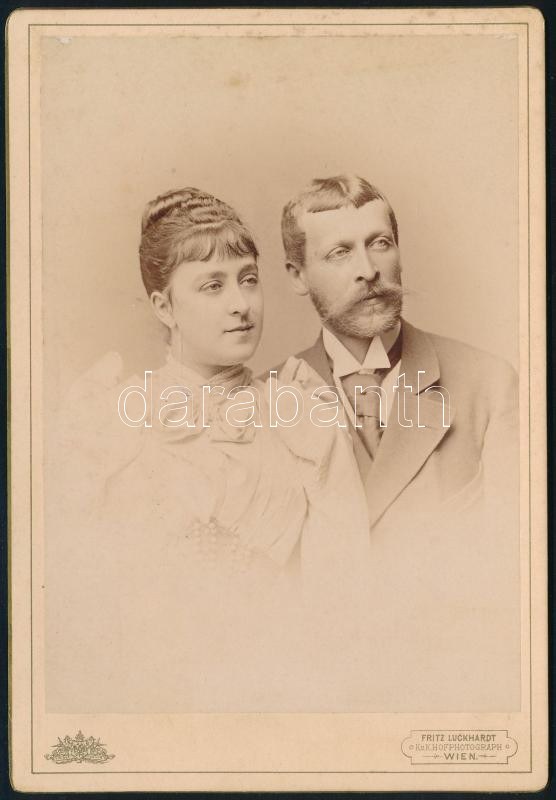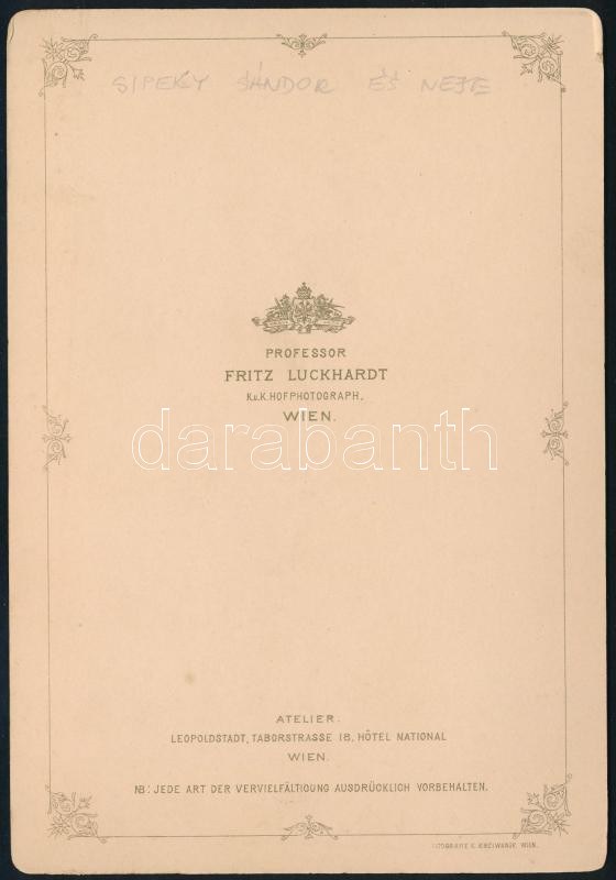cca 1860-1865 paksi Sipeky Sándor (Alsólóc, 1822 - Bécs, 1866) és felesége, herési és oláhsági Piacsek Szidónia (1826-1918) portréja. (Összesen öt gyermekük született, közülük Sipeky Sándor (1857-1929) később katonai és politikai pályán is érdemeket szerzett: tart. huszárfőhadnagy és országgyűlési képviselő, valamint több kitüntetés, köztük a Ferenc József-rend tisztikeresztjének tulajdonosa lett; másodszülött lányuk, Sipeky Karolina (1854-1931) pedig bellusi Baross Gábor (1848-1892) közmunka- és közlekedésügyi miniszterhez, a dualizmus korának neves politikusához ment férjhez 1883-ban.) Kabinetfotó Fritz Luckhardt cs. és kir. udvari fényképész bécsi műterméből, 16,5x11,5 cm