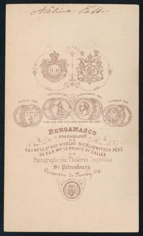 cca 1868 Adelina Patti (1843-1919) olasz operaénekesnő, keményhátú fotó Bergamasco műterméből, 10,5×6...