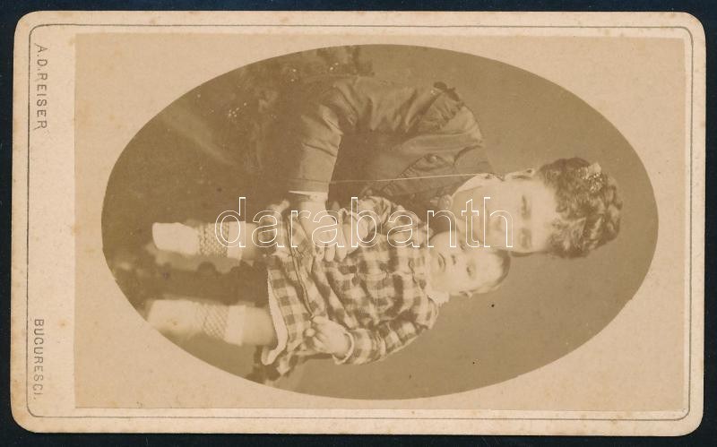 cca 1870-1880 Anya portréja gyermekével, vizitkártya A. D. Reiser bukaresti műterméből, a hátoldalon autográf sorokkal, kis foltokkal, 10,5x6,5 cm // cca 1870-1880 Portrait of a mother with her child, cdv photo from the studio of A. D. Reiser in Bucharest (Bucuresci, Calea Mogosoi No. 23.), with autograph notes on the reverse, with minor stains, 10,5x6,5 cm