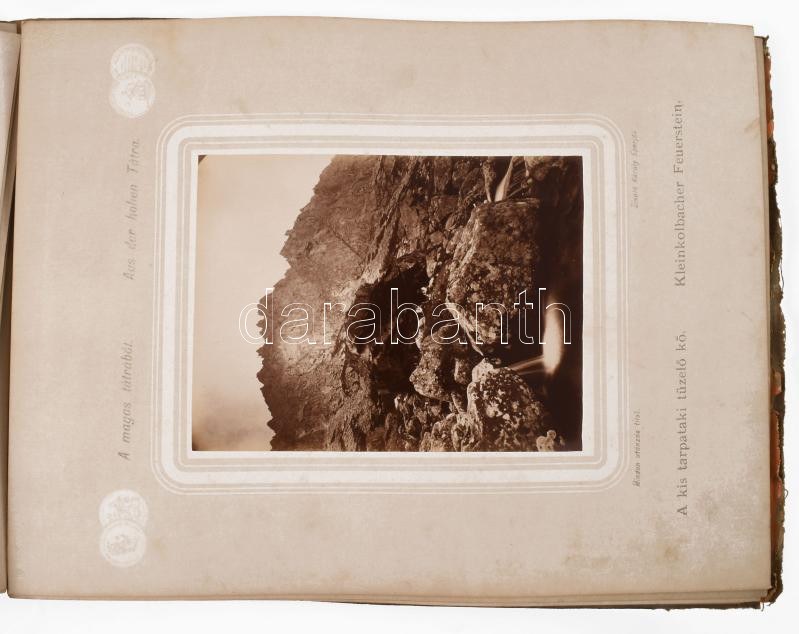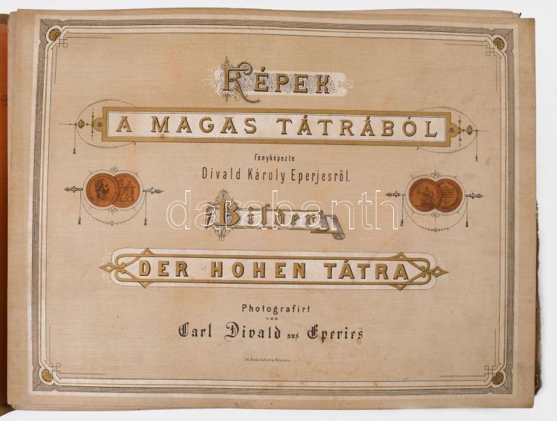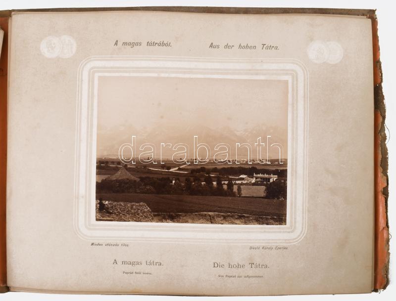 cca 1873-1880 Képek a Magas Tátrából. Fényképezte Divald Károly Eperjesről. Bilder der Hohen Tátra. Photografirt von Carl Divald aus Eperies. [Eperjes, én, Divald Károly], 1 (litografált címlap, lith. Kosch & Scharfin Kaschau [Kassa]) + 30 (fekete-fehér fotók, feliratozott kartonokon) t. Magyar és német nyelvű címlap és feliratokkal. Korabeli aranyozott egészvászon mappában, kopott, foltos, sérült mappával, néhány tábla szélén kis sérülésekkel, két tábla foltos, ami közül az egyik a fotót is érinti, fotók: 12x16 cm, lapok/táblák): 24x32 cm, mappa: 25,5x33x2 cm. cca Pictures from the High Tatras. Photographed by Károly Divald from Eperjes (Presov / Preschau). Bilder der Hohen Tátra. Photografirt von Carl Divald aus Eperies. Eperjes/Presov, Carl Divald, 1 (lithographed title page) t. + 30 (black-and-white photographies on board) t. In Hungarian and German language. Gilt linen binding folder, worn, spotty and damaged folder, with some damages on the edge of the boards, 2 tables are spotty (and one of them the photo spotty too), photos: 12x16 cm, tables/pages: 24x32 cm, folder: 25,5x33x2 cm