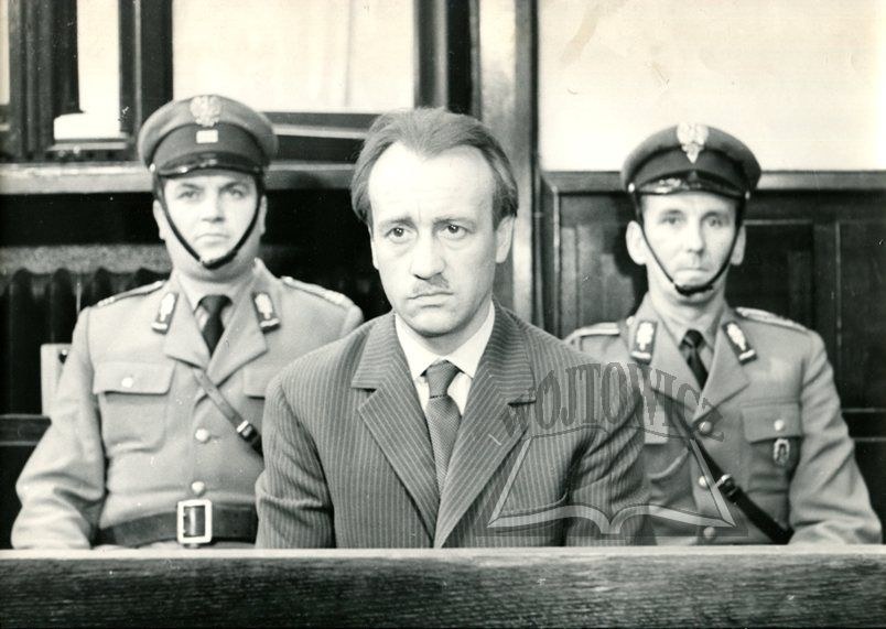 Stan b. dobry. Na odwrocie fotografii pieczęć: Film Polski Warszawa, Mazowiecka 6/8 ... Gangsters and filantropi, Gangsters et Philantropes, (Gangsterzy i filantropi. DirectionL Jezry Hoffman, Edward Skórzewski....". Zdjęcia redakcyjne na potrzeby reklamy filmu we Francji. Komedia sensacyjna. W więziennej karetce spotykają się oskarżeni w dwóch sprawach w tym grupa gangsterów pod wodzą niejakiego Profesora, .... (www.filmpolski.pl). 6370/5