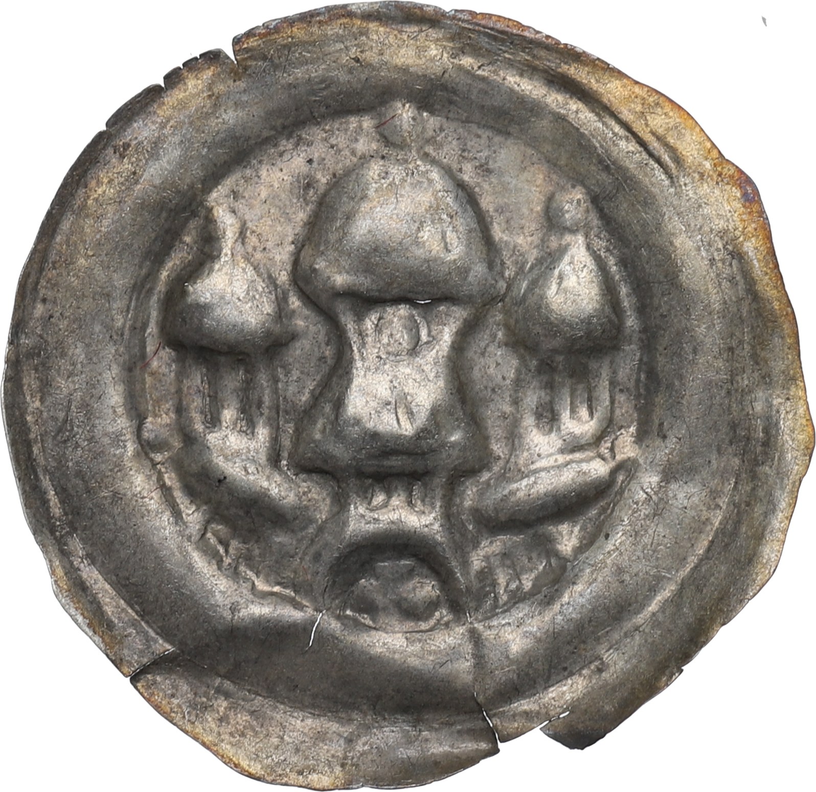 Motyw trzywieżowej budowli, przedstawiony na tym egzemplarzu, nawiązuje do wczesnych denarów polskiego średniowiecza: