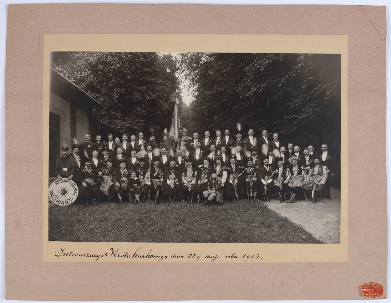 Fotografia o wym. 37,8 x 24,5 cm, podklejona na kart. podkład zakładu o wym. 50,2 x 39 cm. Fotografia opisana u dołu piórem: "Intronizacya Króla kurkowego dnia 22 maja roku 1913". W p. d. rogu nalepka zakłądu fotograficznego powiększeń i cynkograficznego Marka Münza we Lwowie, ul. Jagiellońska L. 15 Parter. Nadpęknięcie p. g. narożnika.
