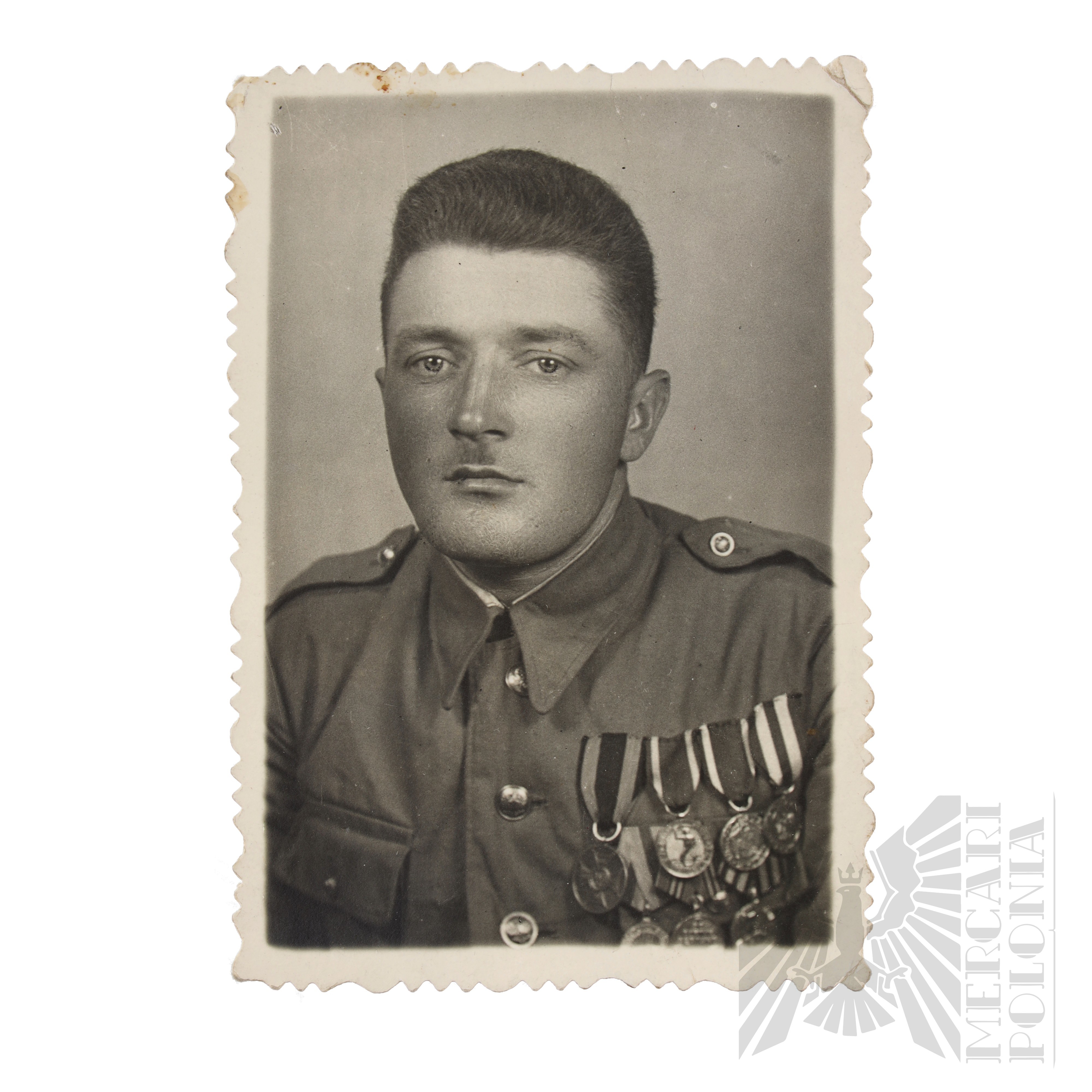 Fotografia portretowa żołnierza Ludowego Wojska Polskiego z doskonale widocznymi odznaczeniami. Przede wszystkim Medal Zasłużonym na Polu Chwały, Medalem za Warszawę 1939-45, Medalem za Odrę, Nysę, Bałty, Medal KRN Zwycięstwa i Wolności.