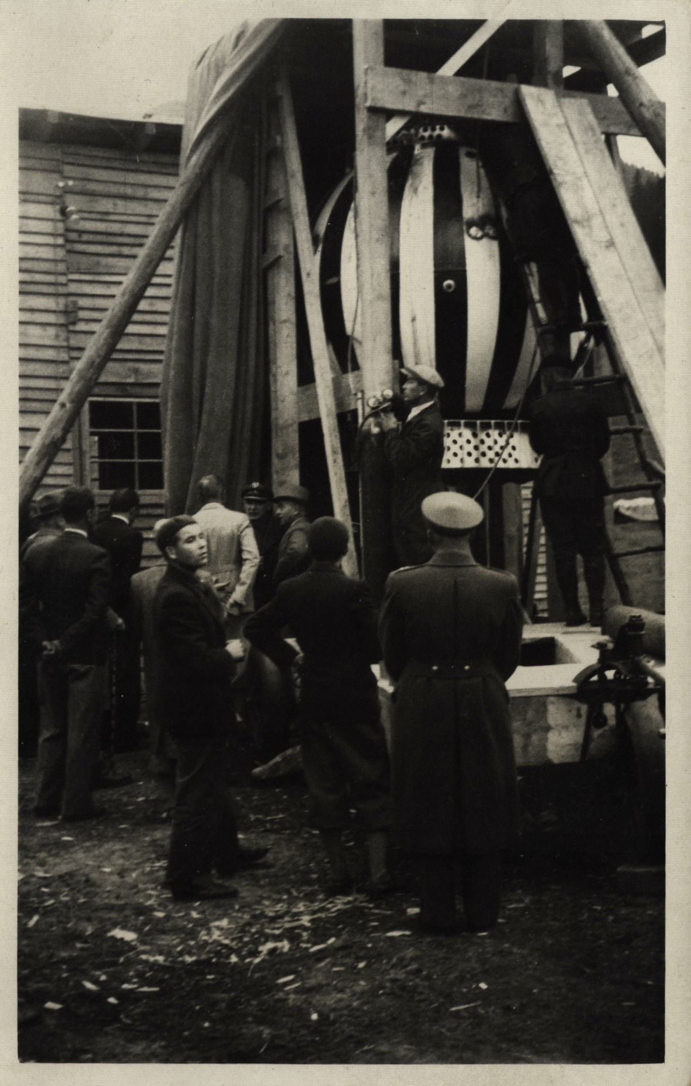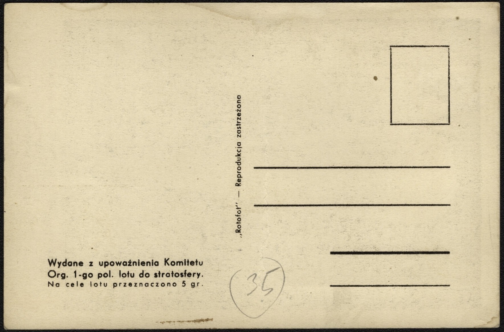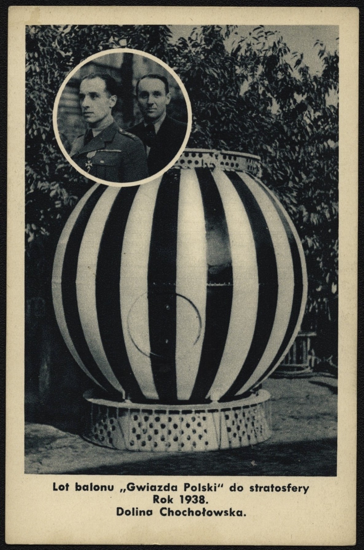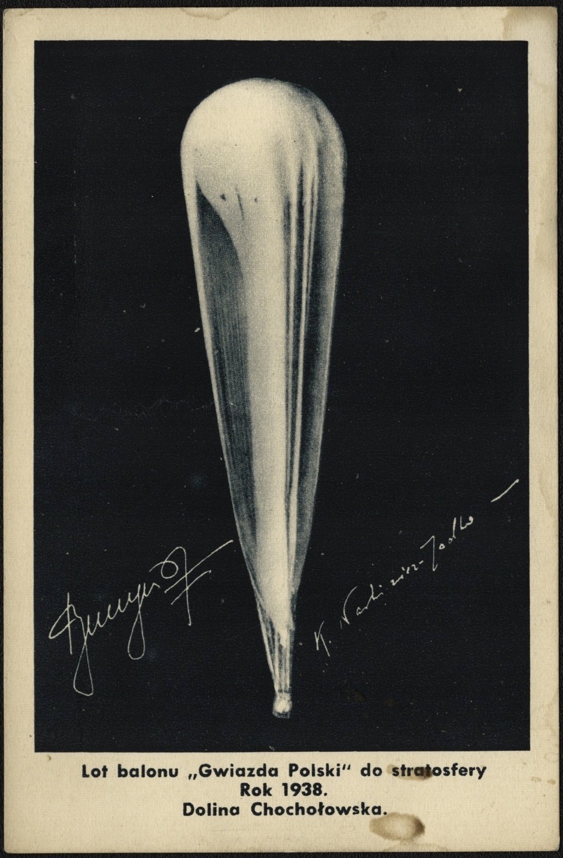 Lot balonu "Gwiazda Polski" do stratosfery. Rok 1938. Dolina Chochołowska.] Załoga balonu: pil. Zbigniew Burzyński, obs. dr Konstanty Narkiewic-Jodko] karta pocztowa o wym. 14,8 x 9,7 cm.