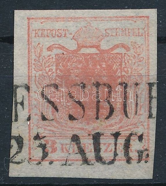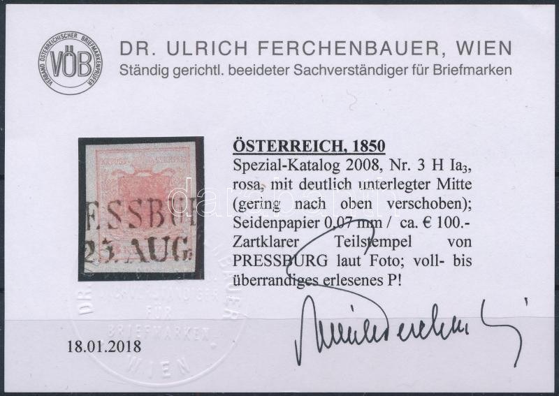 1850 3kr HP Ia3 rózsa, kiemelt középrésszel, 0,07 mm-es papíron / rose with highlighted middle part, on 0,07 mm paper "(PR)ESSBUR(G)" Certificate: Ferchenbauer