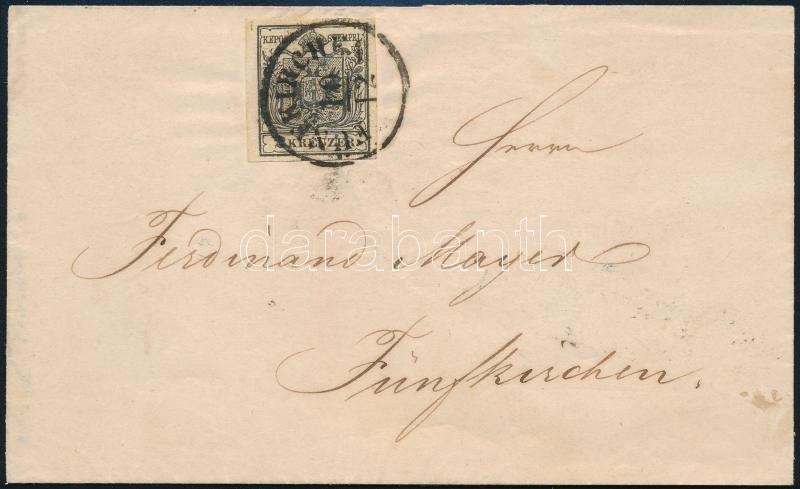 1855 Teljes levél 2kr bérmentesítéssel, Pécsen helyiként postázva / Complete cover with Mi 2 franking "FÜNFKIRCHEN", összesen 3 helyi levelet ismerünk Fünfkirchen-ből