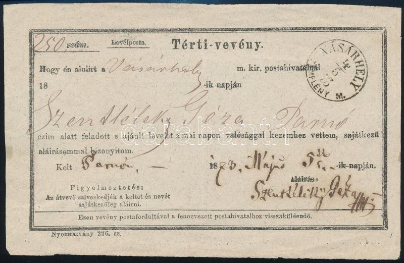 1873 Tértivevény hátoldalán letépett 10kr / Retour recepisse with torn 10kr "VÁSÁRHELY / ZEMPLÉN M....