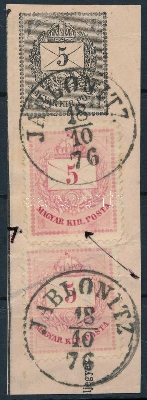 1874 2 x 5kr díjjegyes kivágáson, javítással / 2 x 5kr on cutting with retouches "JABLONITZ"