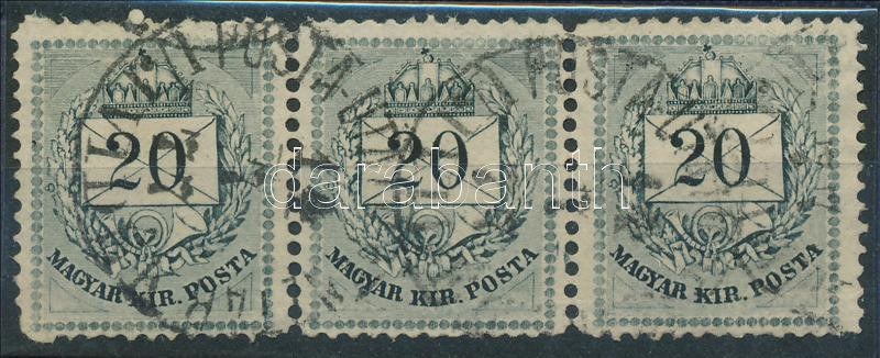 1874 20kr hármascsík, mindegyik bélyegen ernyős javítás / stripe of 3 with retouches