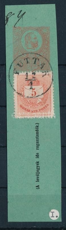 1874 5kr I. típus Réznyomat díjjegyes kivágáson, durva gyöngyjavítással (ex Lovász) / Mi 17 with retouche on PS-cutting "FUTTAK"