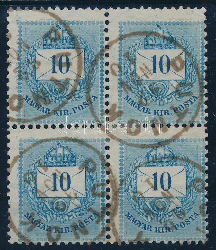 1881 10kr négyestömb elfogazva, gyöngyjavítással / shifted perforation, retouche
