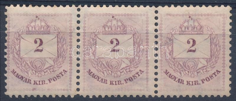 1881 2kr 3-as csík a "KIR" szó alatt gyöngysor javítás (ex Lovász) / Mi 21 strip of 3 with retouches