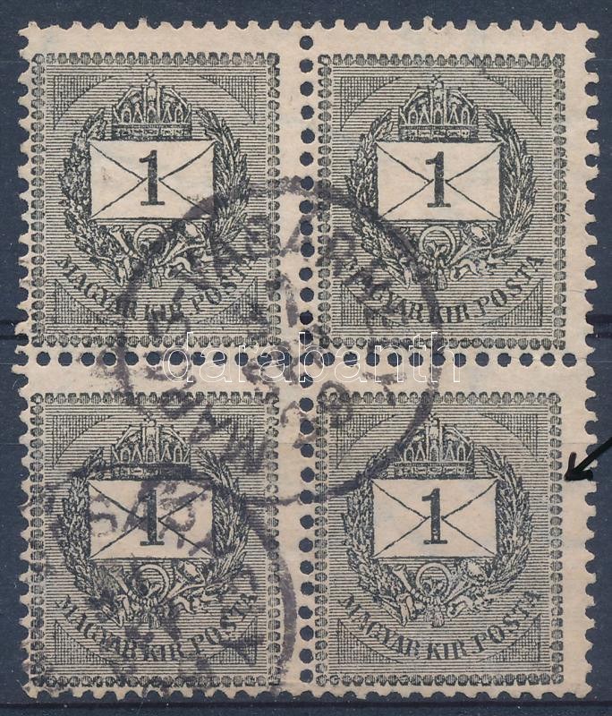 1889 1kr négyestömb lemezhibával / block of 4 with plate flaw