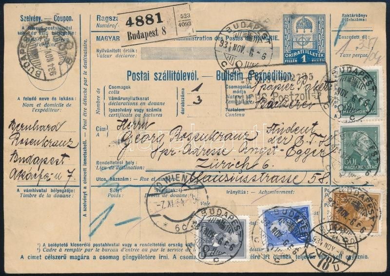1934 Szállítólevél Arcképek 1f + 4f + 30f + 2 x 50f bérmentesítéssel Svájcba küldve / Parcel card with 135f franking to Switzerland