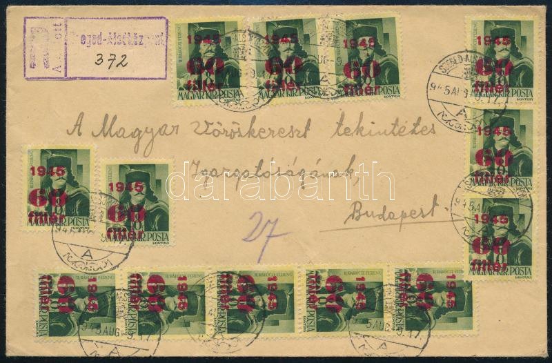 1945 (2. díjszabás) Távolsági ajánlott levél 8P bérmentesítéssel, 13 x 60f/8f bélyeggel. 20f tarifahiány...