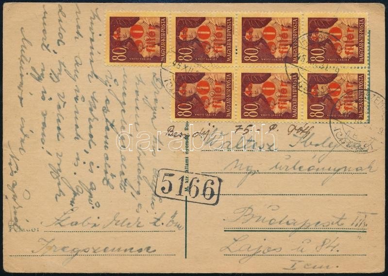 1945 (35 díjszabás) Levelezőlap 7 db bélyeggel és készpénzes bérmentesítéssel ...