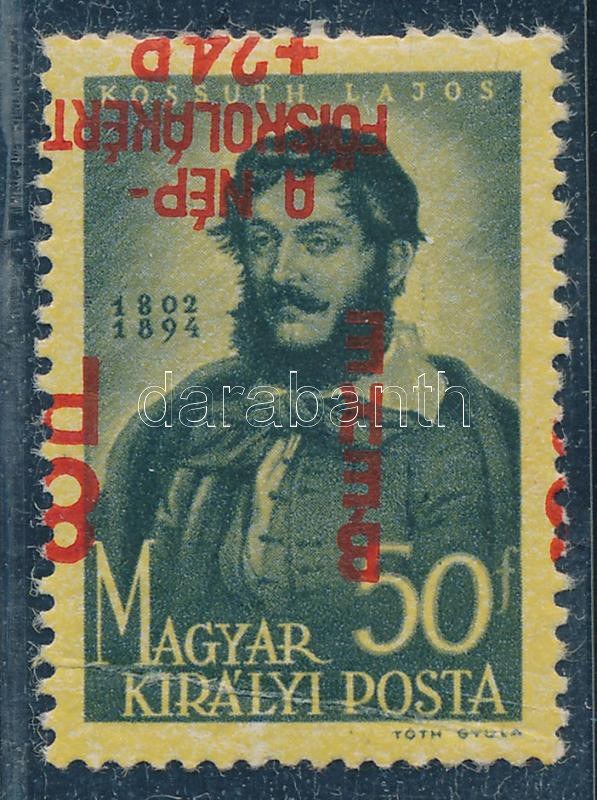 1945 Béke 8+24P/50f fordított felülnyomással (alul törés) / Mi 776 with inverted overprint (folded below)