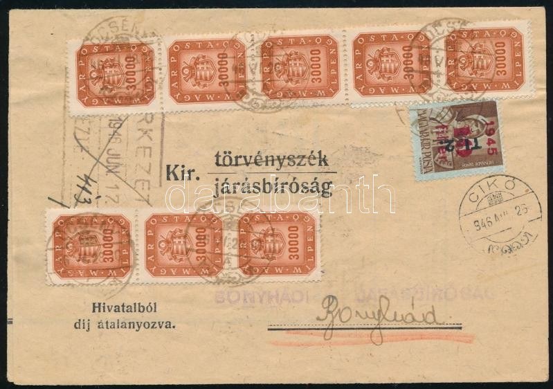 1946.03.05-én feladott Kézbesítési bizonyítvány, amelyet 1946.06.28-án továbbküldtek 240.000 Milpengő bérmentesítéssel / Printed matter with 240.000 Milpengő franking "ŐCSÉNY" - "BONYHÁD"