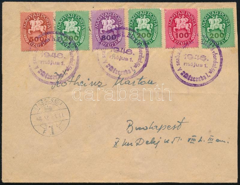 1946 (14. díjszabás) Levél 6 db Lovasfutár bélyeggel és gumi bélyegzéssel / Cover with 6 stamps and auxiliary postmark