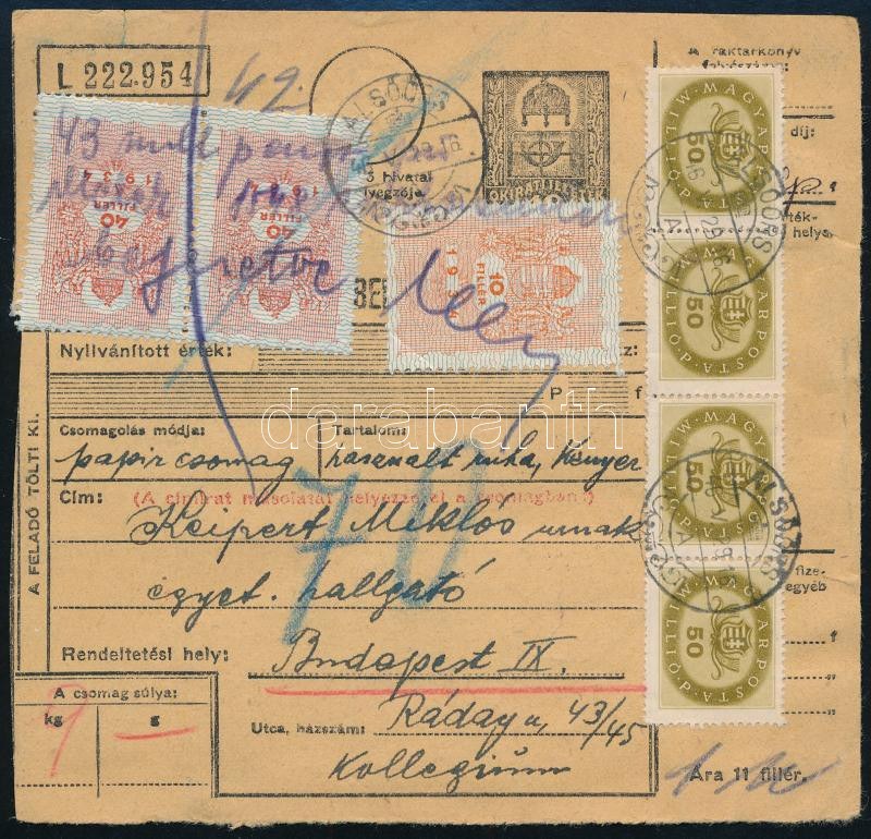 1946 (17. díjszabás) Csomagszállító 9 kg-os csomagról, 28 bélyeggel kiegészítve és 3 db okmánybélyeggel "ALSÓÖRS" - Budapest / Parcel card with 28 postal and 3 fiscal stamps