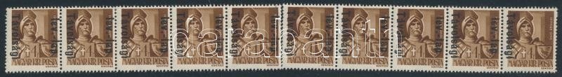 1946 Betűs Távolsági lev.-lap/4f 10-es csík a felülnyomat látványos eltolódásával / Mi 873 stripe of 10 with shifted overprint