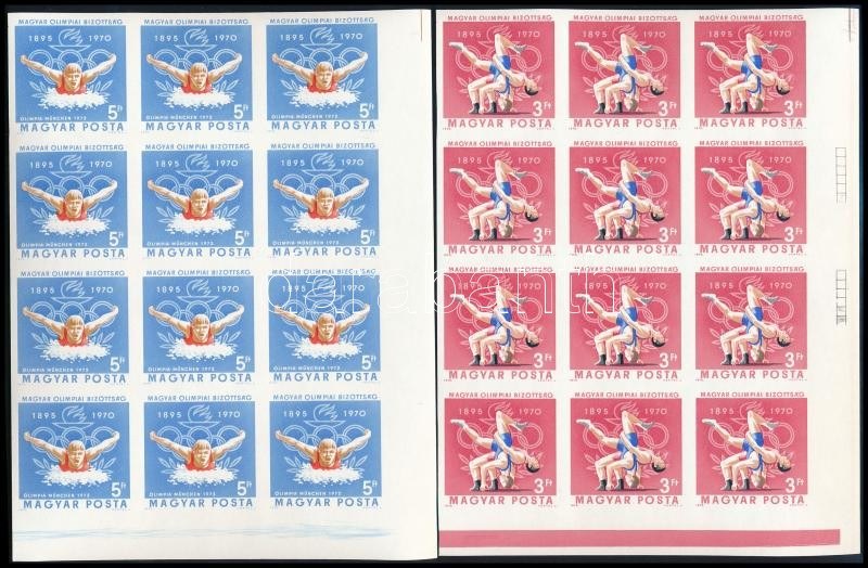 1970 Magyar Olimpiai Bizottság vágott sor ívsarki 12-es tömbökben, a legtöbb nyomdai jelzésekkel (42.000) / Mi 2616-2623 imperforate corner blocks of 12