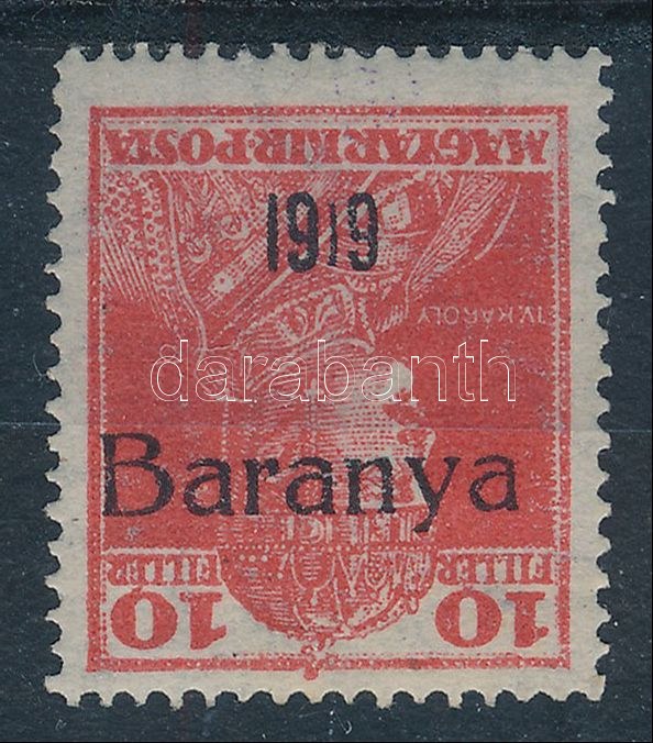 Baranya I. 1919 Károly 10f fordított felülnyomással (**22.000) / Mi 35 with inverted overprint. Signed...