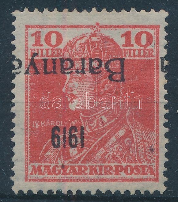 Baranya I. 1919 Károly 10f fordított felülnyomással / inverted overprint. Signed: Bodor