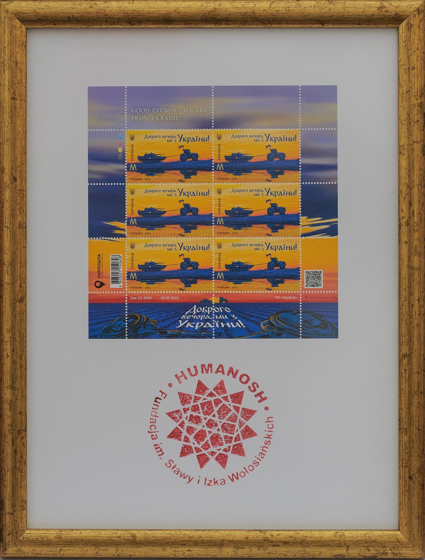 Zestaw znaczków pocztowych, 13 x 12,5 cm; pieczęć Fundacji Humanosh im. Sławy i Izka Wołosiańskich