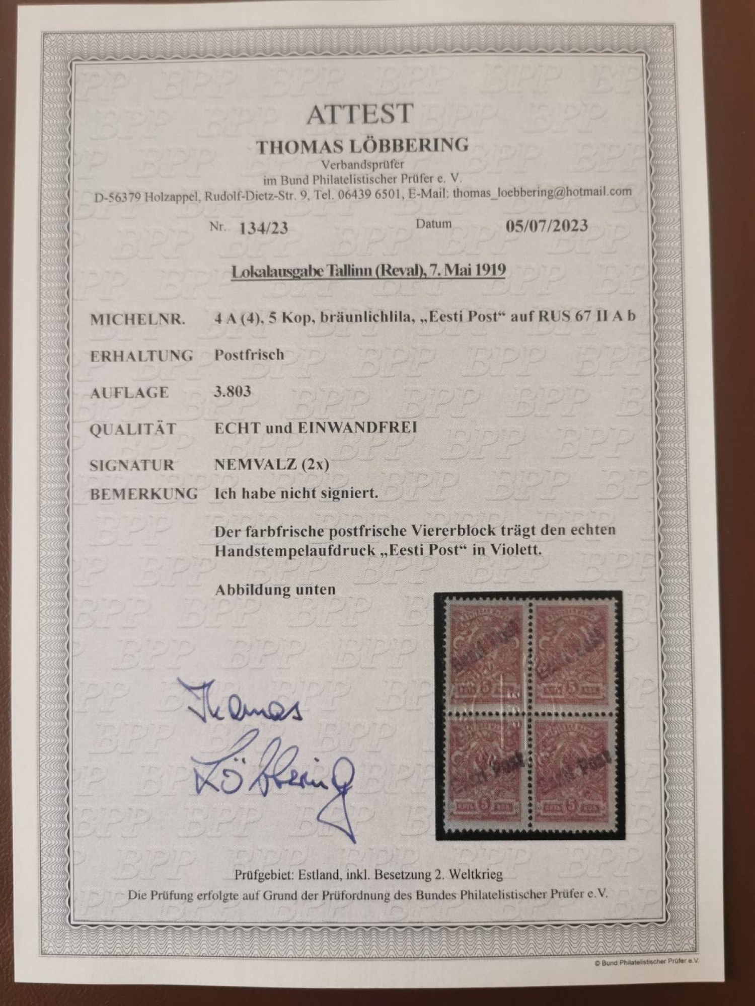 Estonia stamp 5 kop with Eesti Post overprint 4-block MNH - cert. T. Löbbering, sign. Nemvalz