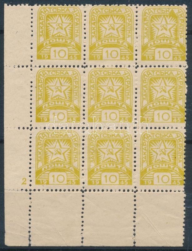 Kárpát-Ukrajna 1945 10f bal ívsarki 9-es tömb, sárga / 10f corner block of 9, yellow