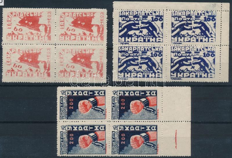 Kárpát-Ukrajna 1945 3 klf négyestömb / Carpathian-Ukraine 1945 3 different blocks of 4
