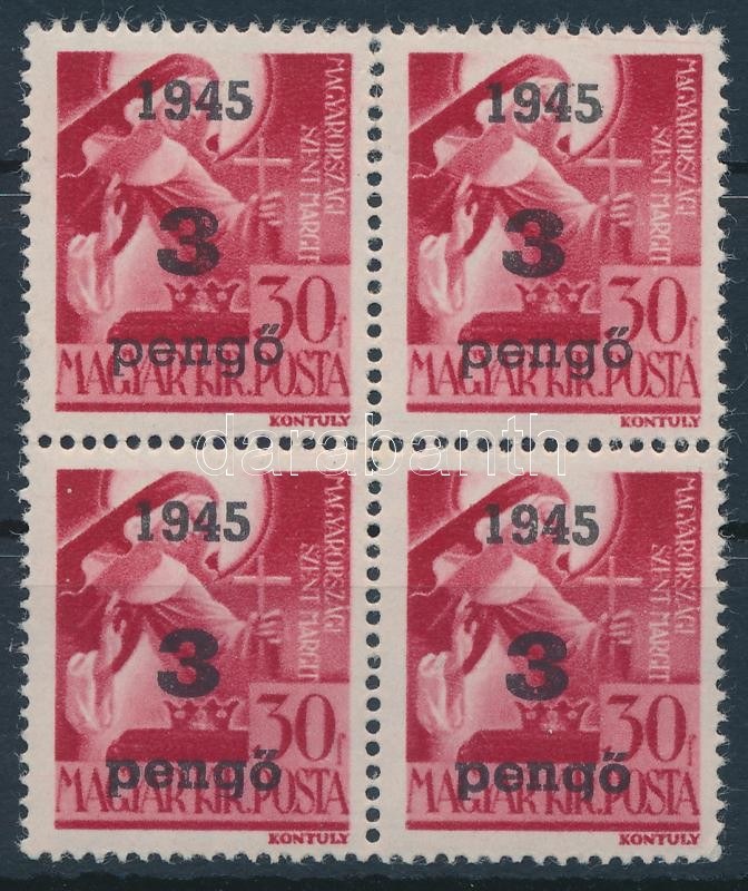 Nagyvárad I. 1945 Szent Margint 3P/30f 4-es tömb, benne I+III típusú felülnyomás, minden bélyeg Bodor vizsgálójellel (79.200) / block of 4, type I+III. Each stamp signed: Bodor
