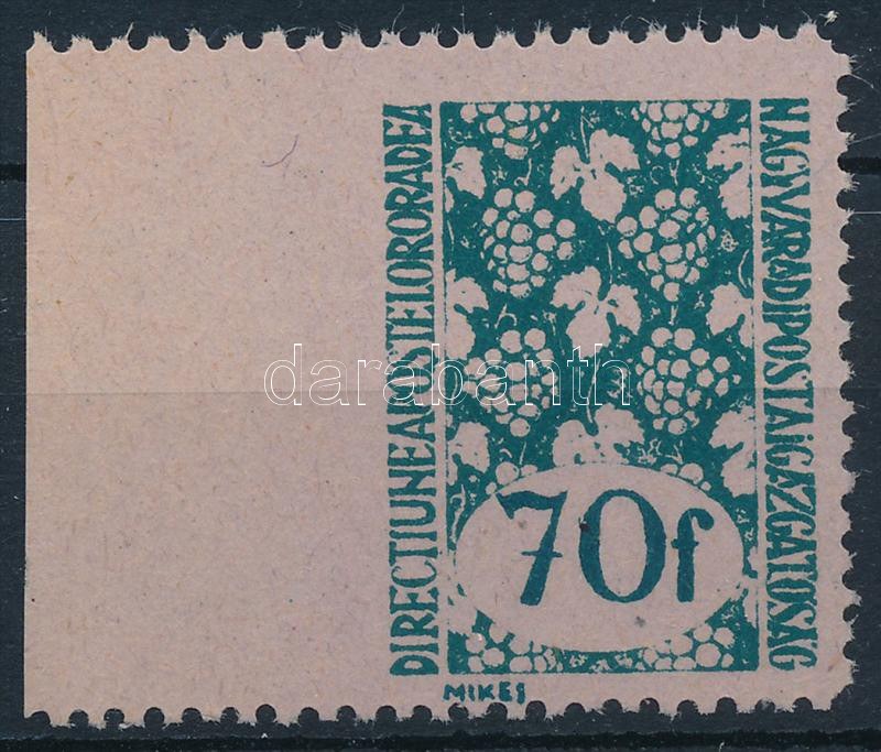 Nagyvárad II. 1945 70f bal oldalon fogazatlan. Az irodalom nem említi, egy ívben 12 db létezhet! / 70f imperforate on the left side. The literature does not mention it! Signed: Bodor