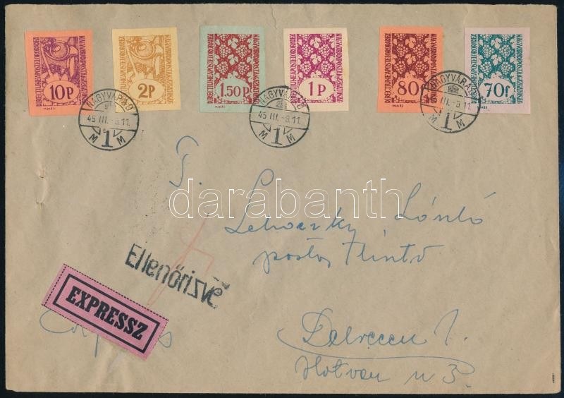 Nagyvárad II. 1945 Expressz levél 6 db Nagyvárad II. vágott bélyeggel bérmentesítve, Nagyváradról Debrecenbe (szakadás) / Express cover with 6 imperforate stamps. Signed: Bodor (torn)