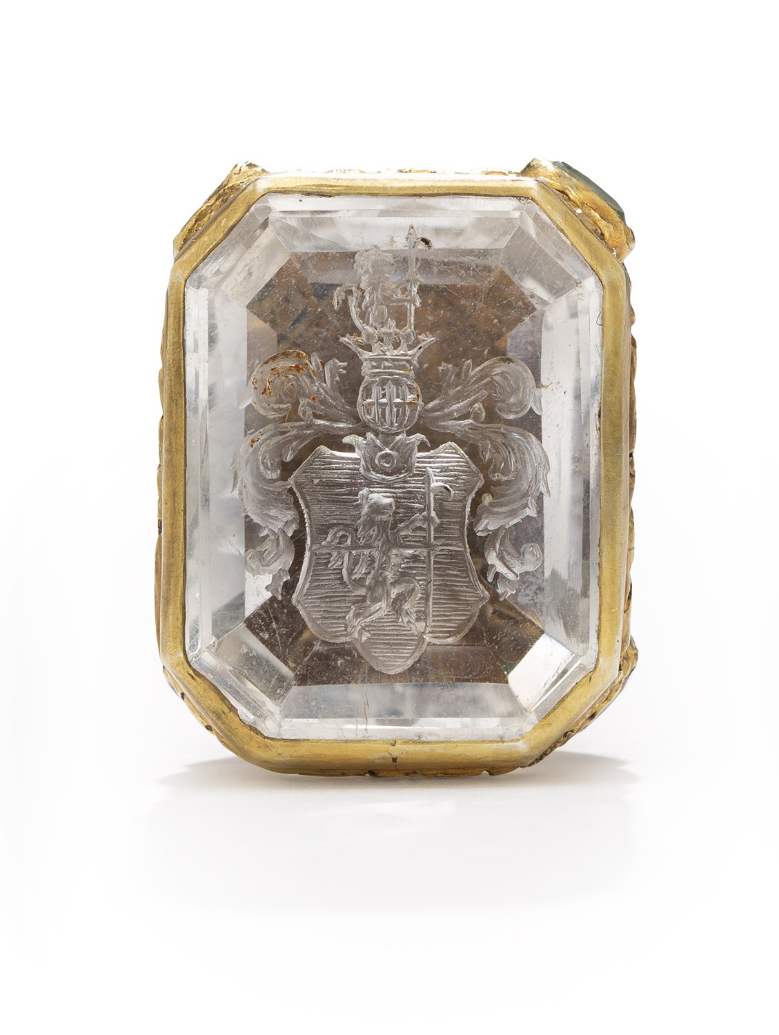 kość, kryształ górski, srebro złocone, 4 szmaragdy, 2 oliwiny, 1 rubin, 4 spinele, 1 granat