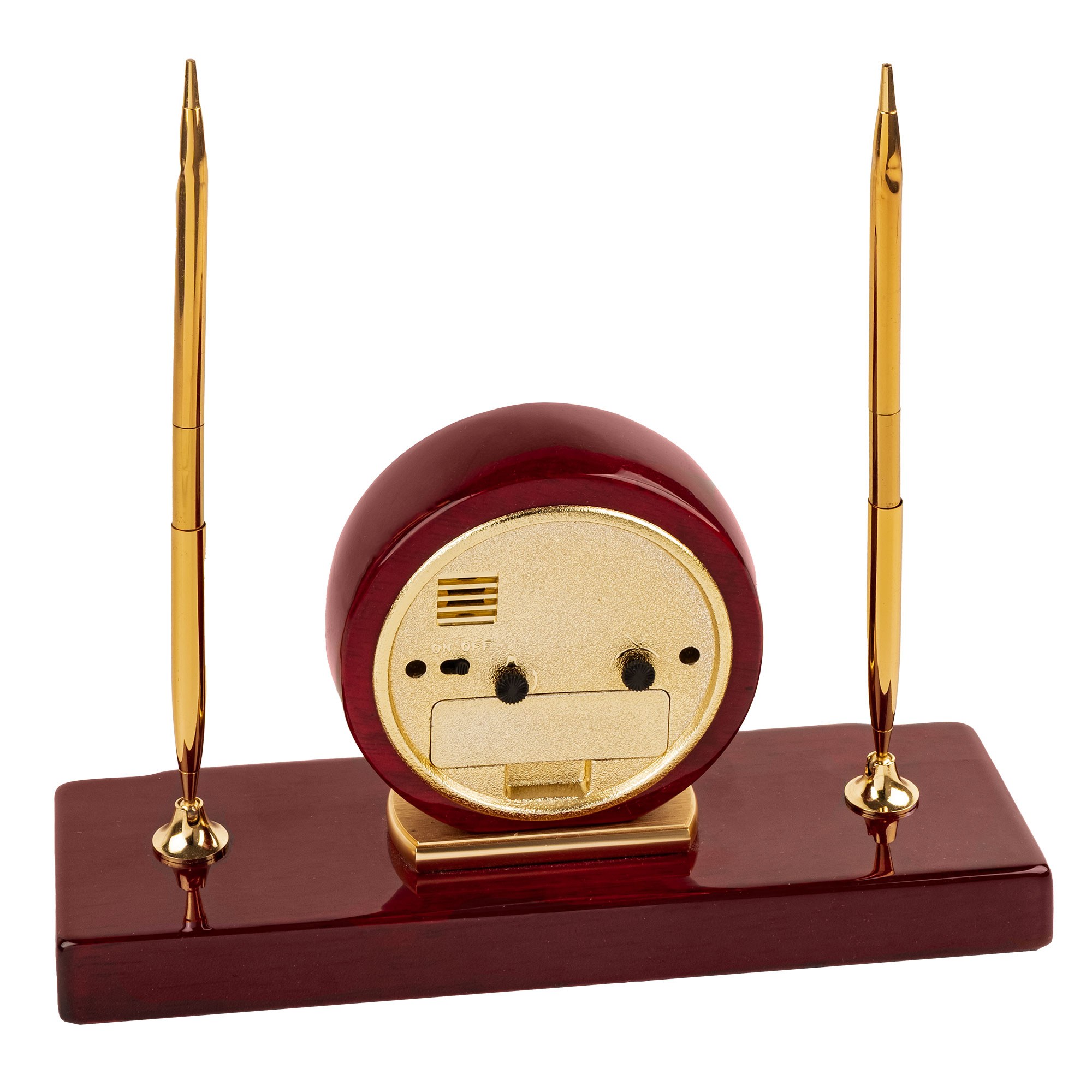 Elegancki zegar biurkowy z podstawką na dwa pióra – prezent o charakterze dyplomatycznym, związany z osobą Lecha Wałęsy, laureata Pokojowej Nagrody Nobla i prezydenta RP. Przedmiot rangi historycznego „souvenir de bureau”: materialny znak epoki przełomu, kojarzony z pokojową zmianą i siłą obywatelskiej odwagi.