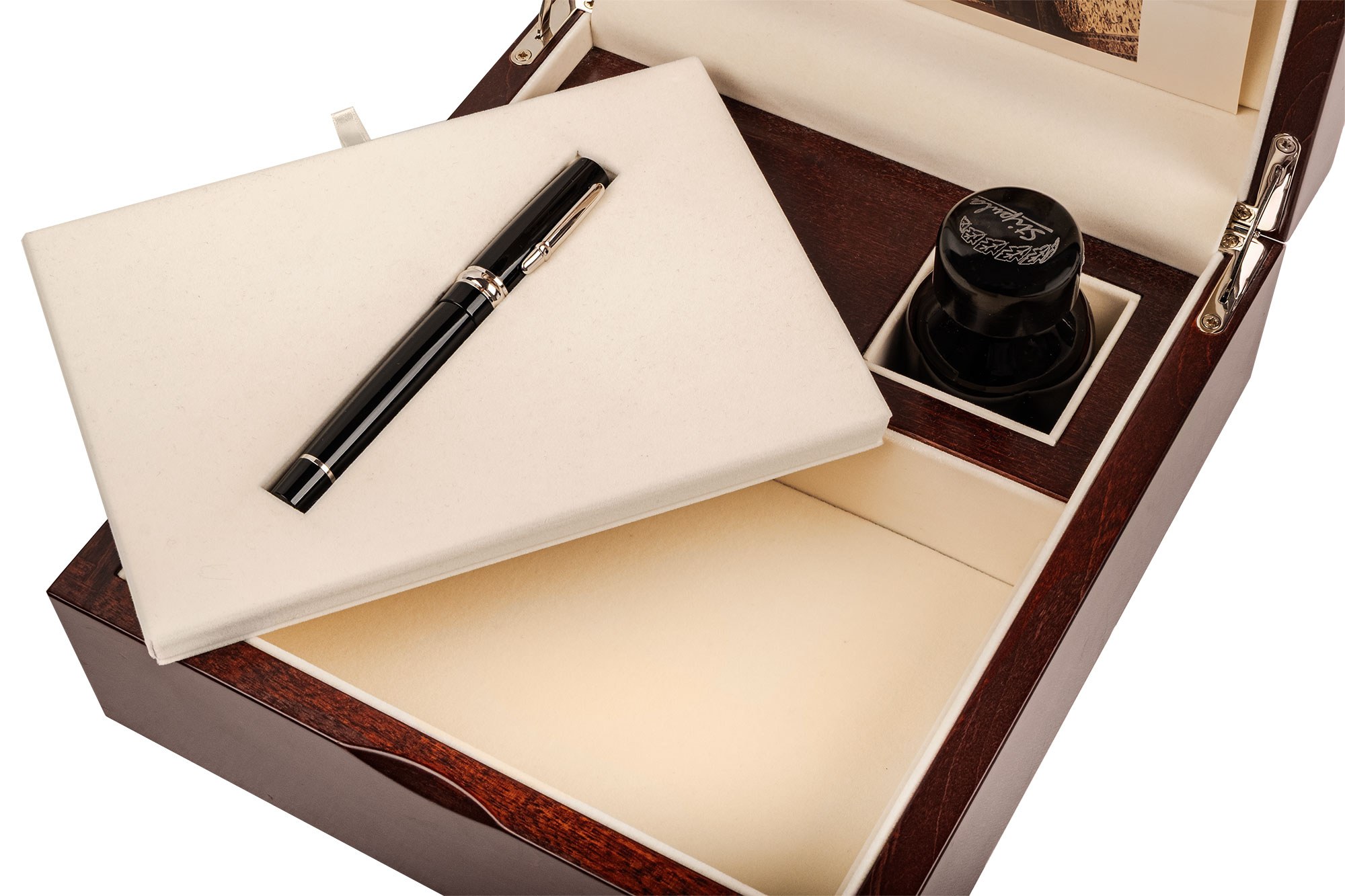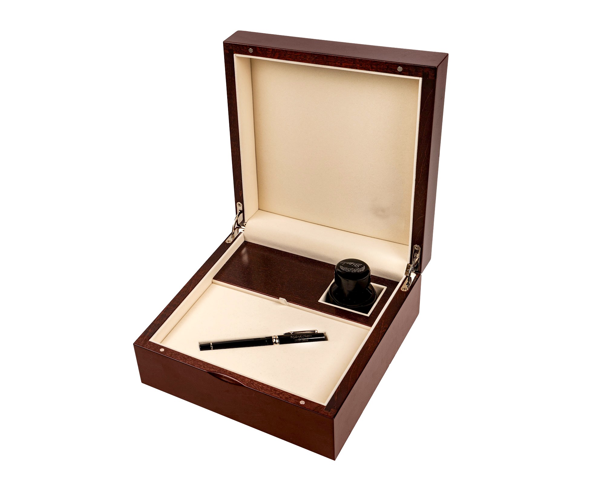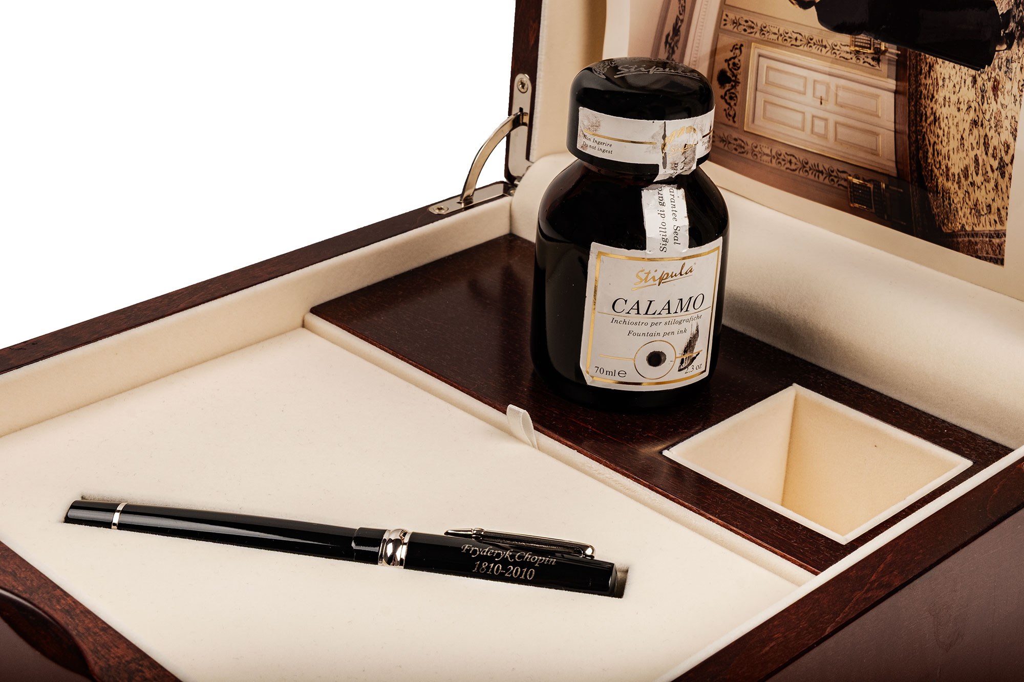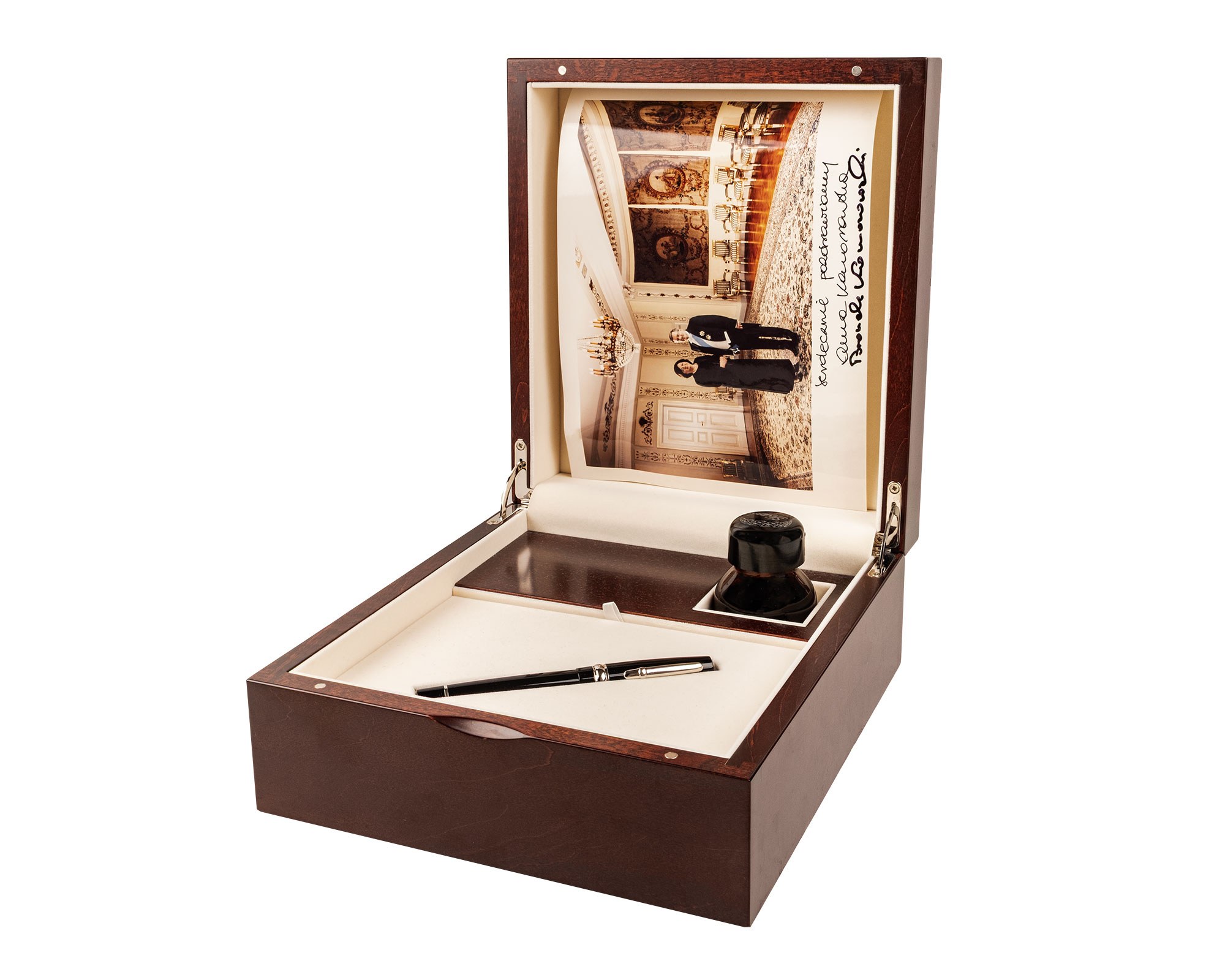 Gabinetowy zestaw piśmienniczy – pióro wieczne z kałamarzem w eleganckiej kasecie. Związany z Bronisławem Komorowskim, prezydentem RP; nośnik idei pojednania i odpowiedzialności w życiu publicznym. Zestaw łączy funkcjonalność z rangą symboliczną – świetny obiekt do reprezentacyjnej biblioteki.