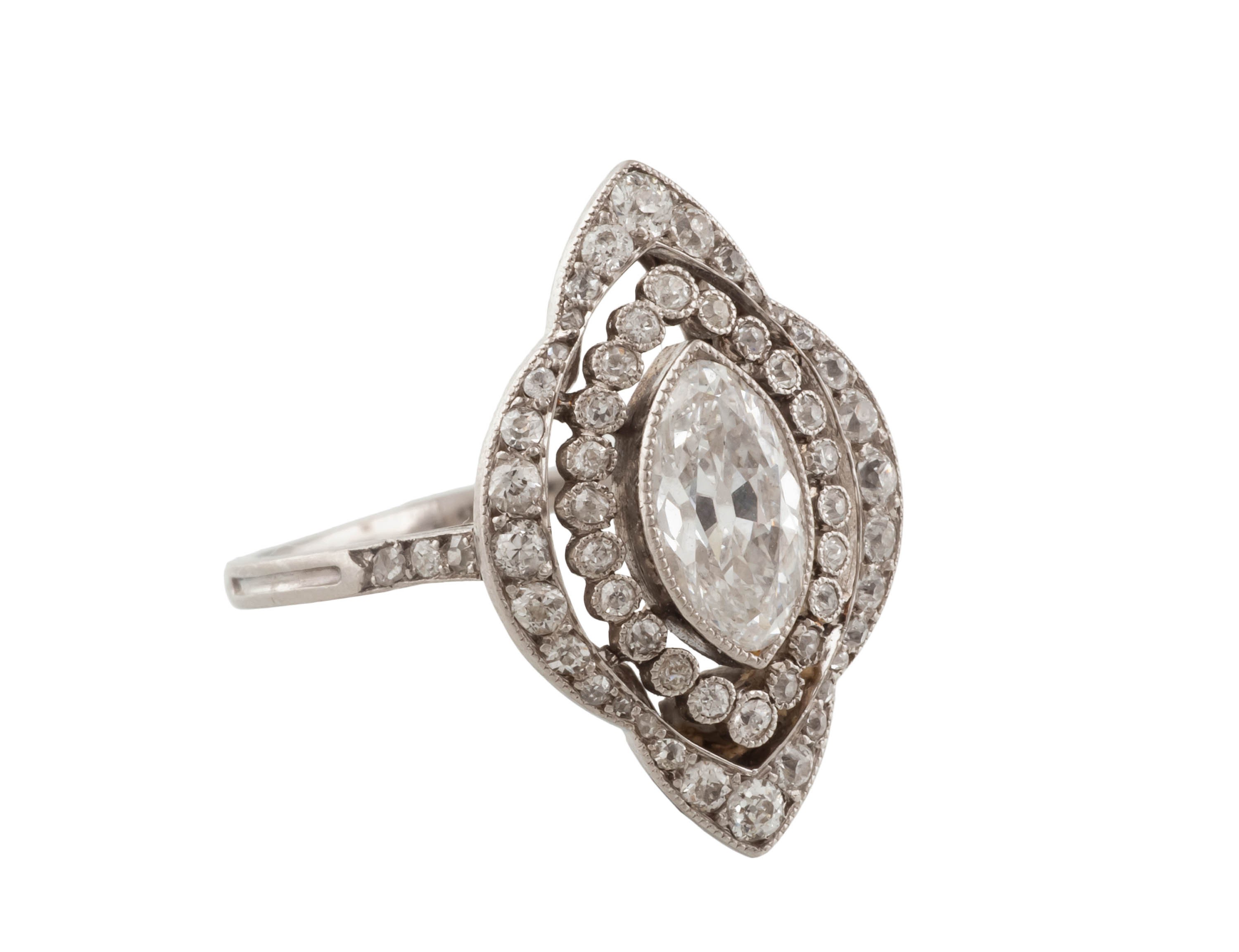 platyna, m. 5,11 g, diament w szlifie markiza ok. 0,80 ct, G-H/SI1, 60 szt. diamentów w uproszczonym szlifie 8/8 łącznie ok. 0,66 ct, G-J/SI-P