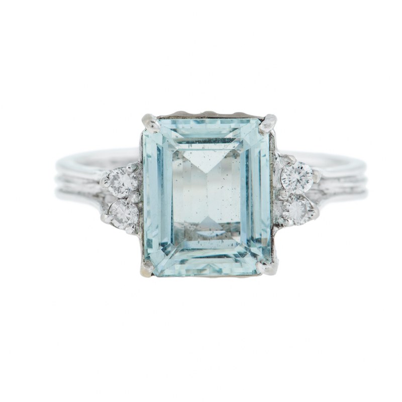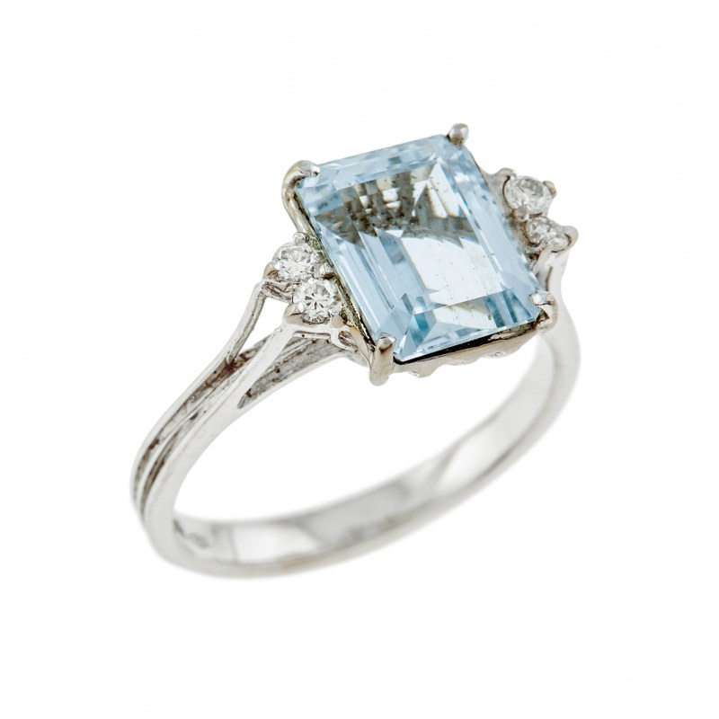 białe złoto pr. ~ 0,750, rodowane, 1 szt. akwamaryn w szlifie szmaragdowym ~ 2,70 ct, 4 szt. brylantów ł.~ 0,12 ct I/Si-P1, masa: 3,75 g; rozmiar: 16