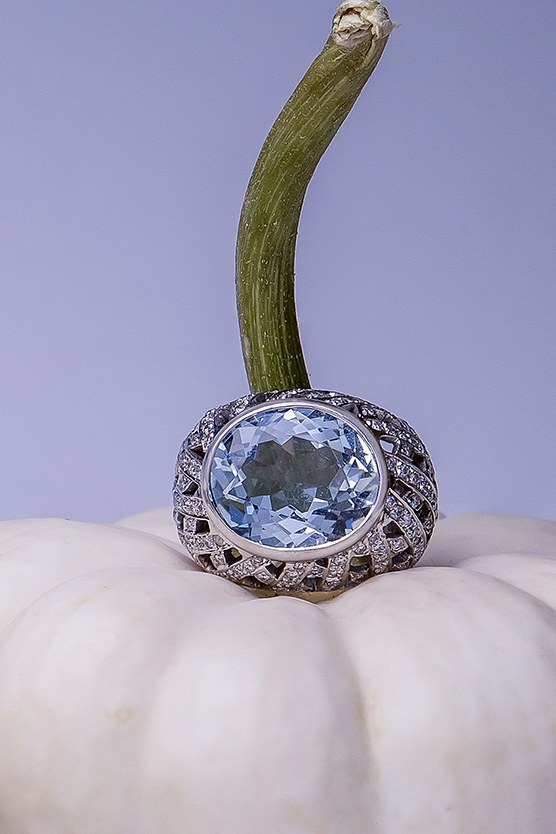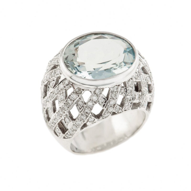 białe złoto pr. ~ 0,750, rodowane, 1 szt. akwamaryn ~ 6,01 ct, 135 szt. brylantów ł. ~ 0,70 ct H/Si-P2, masa: 14,87 g; rozmiar: 9