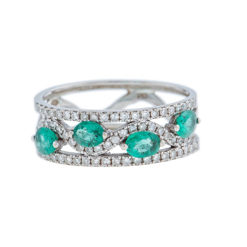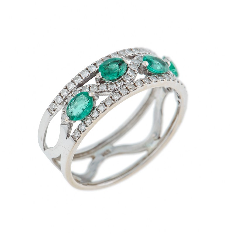 białe złoto pr. ~ 0,750, rodowane, 4 szt. szmaragdów ł. ~ 0,55 ct, 64 szt. diamentów w szlifie 8/8 ł. ~ 0,35 ct H-L/Si-P1, masa: 2,64 g; rozmiar: 12