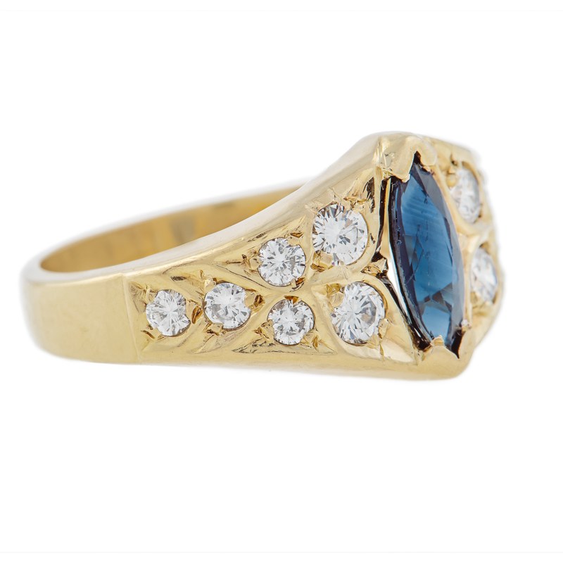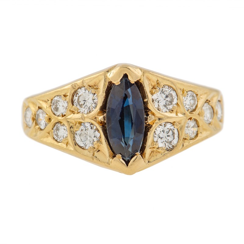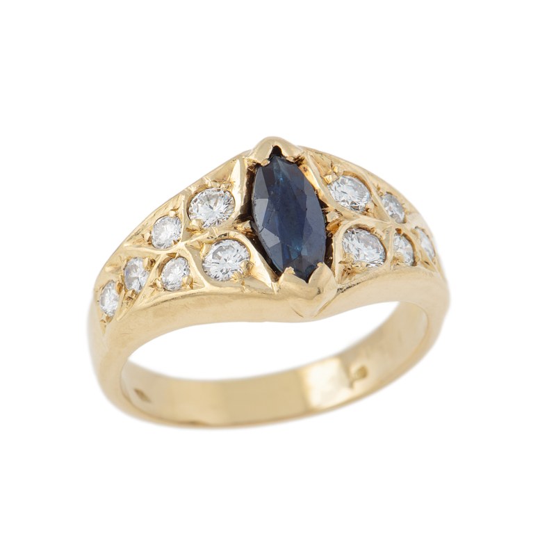 złoto pr. ~ 0,750, 1 szt. szafir w szlifie markizy ~ 0,65 ct, 12 szt. brylantów ł. ~ 0,48 ct H/Si1-Si2, masa: 5,68 g; rozmiar: 16