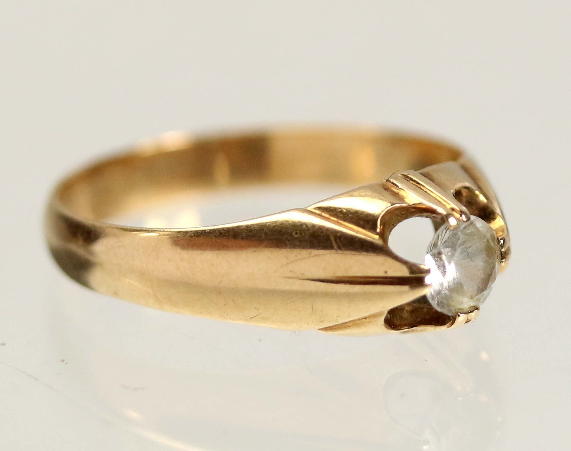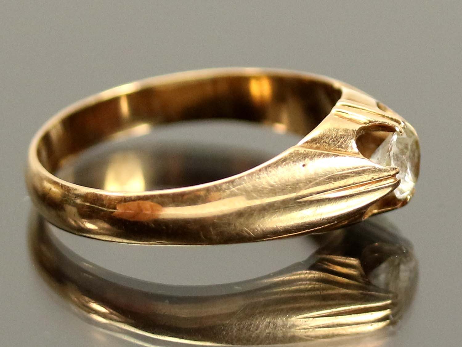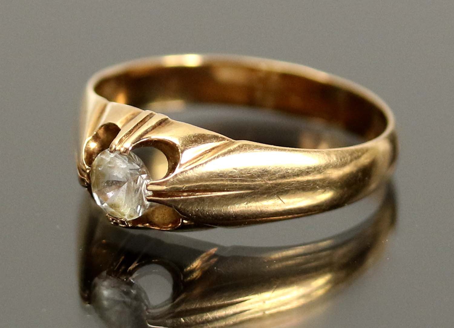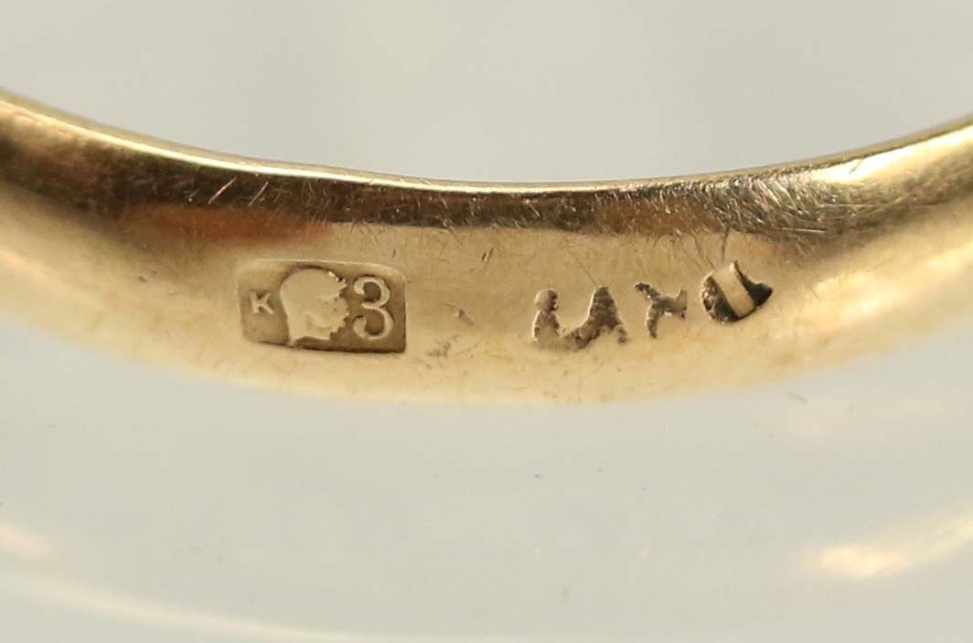 Pierścionek z cyrkonią, Rytosztuka. Złoto. Sygnatura wytwórcy oraz krakowska próba 3 sprzed 1963 r. Waga 3,25 g. Rozmiar pierścionka 14.