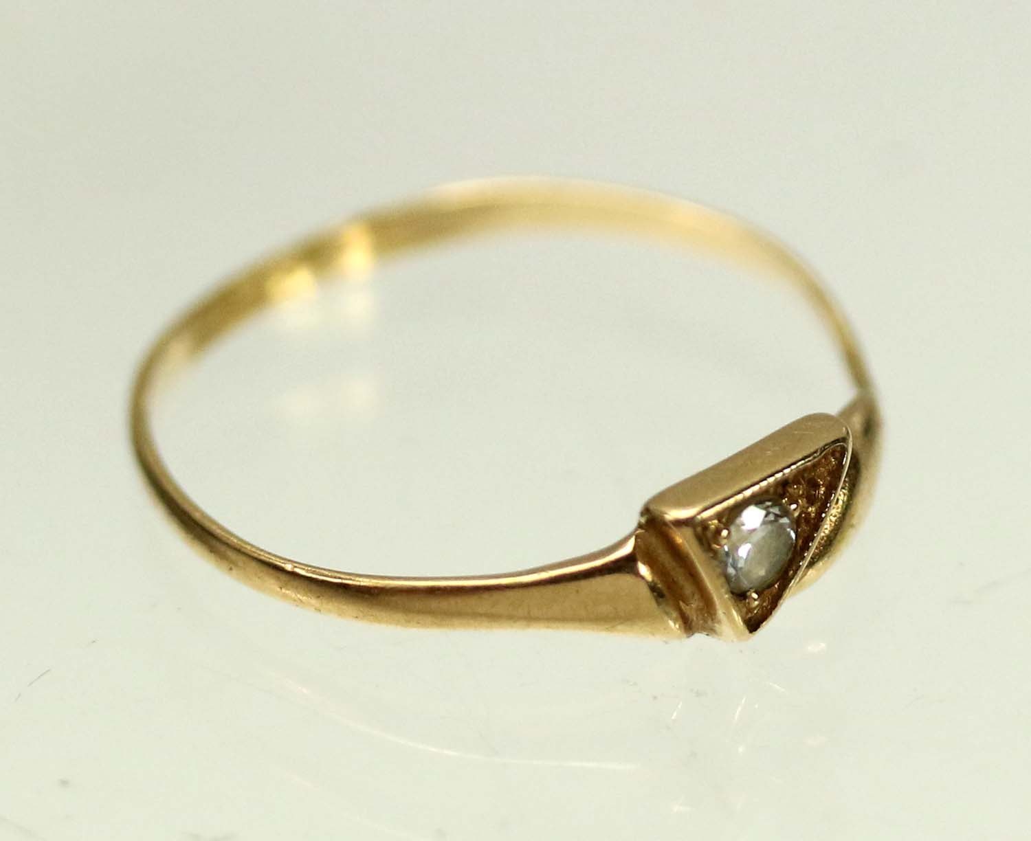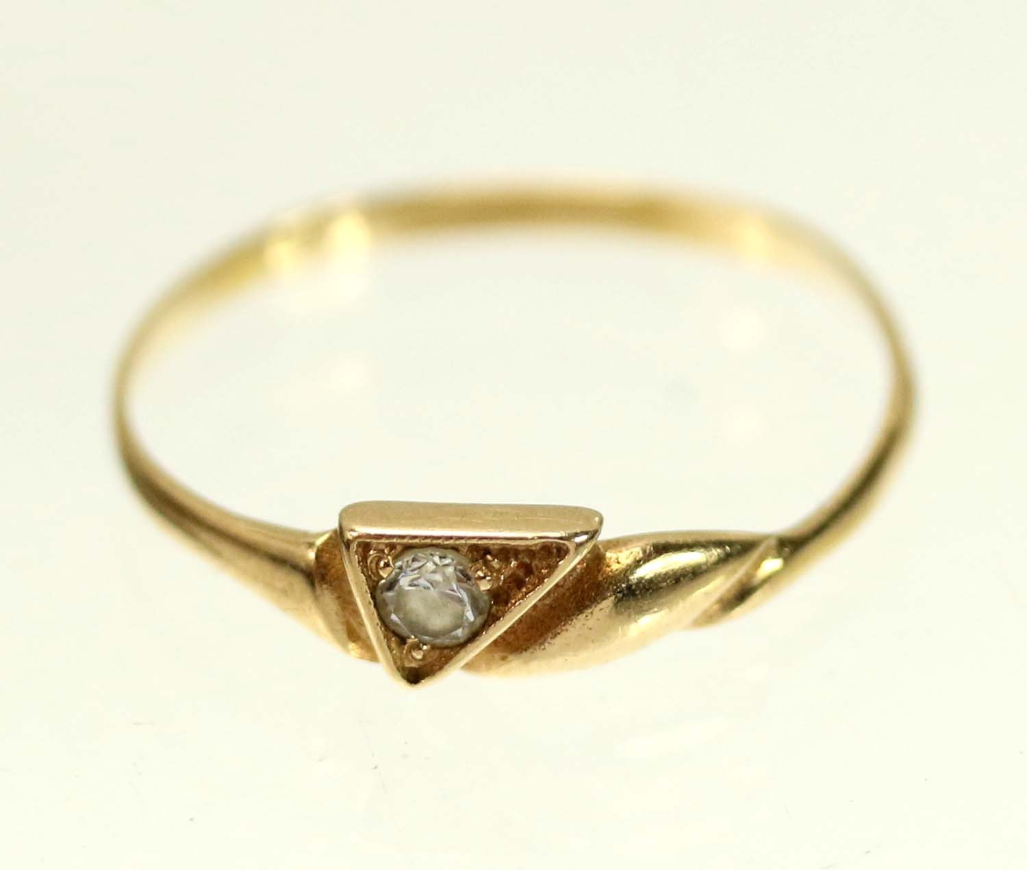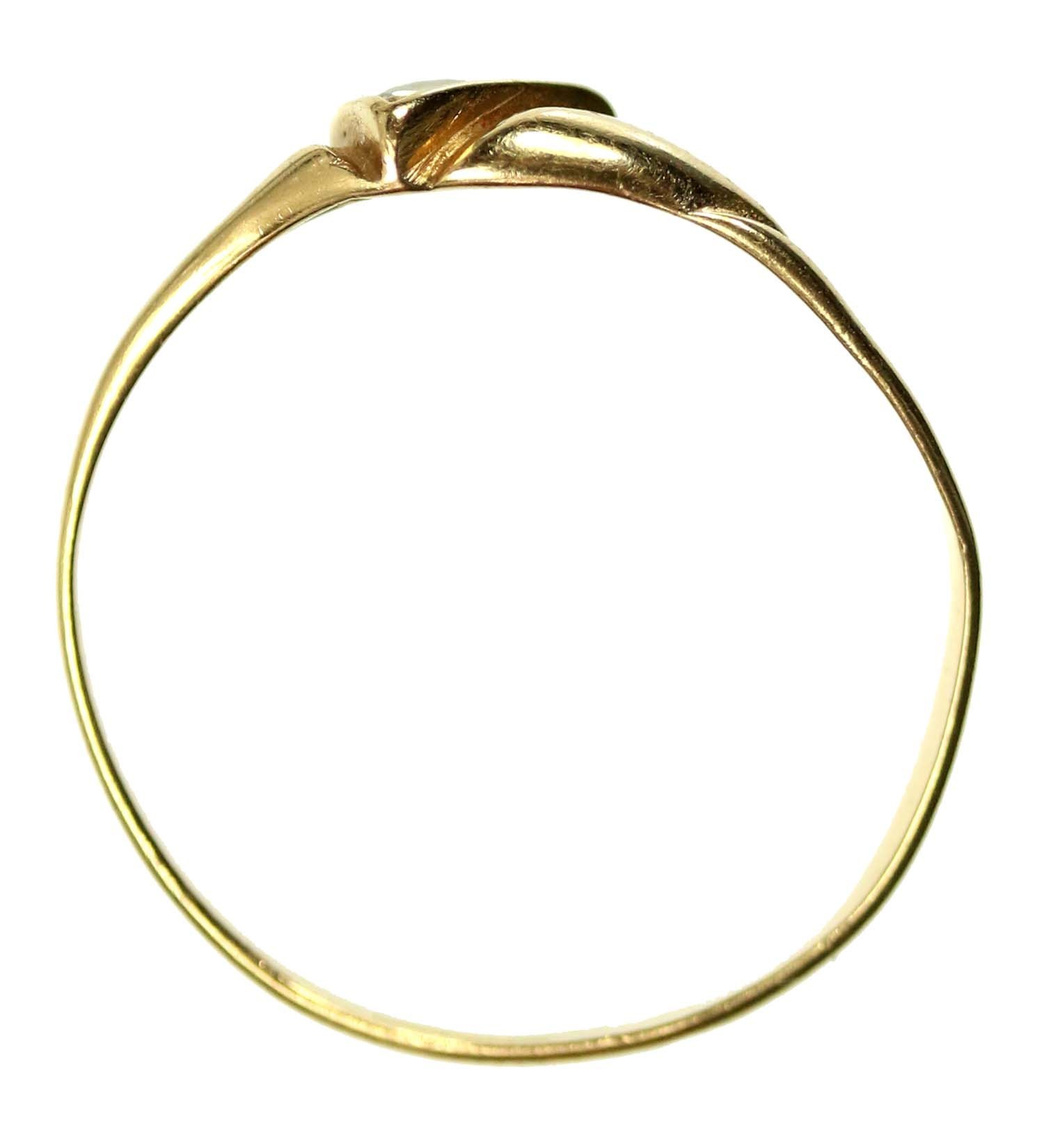 Pierścionek z cyrkonią. Złoto, sygnatura nieczytelna, brak informacji o próbie. Waga 1g. Rozmiar pierścionka 14.