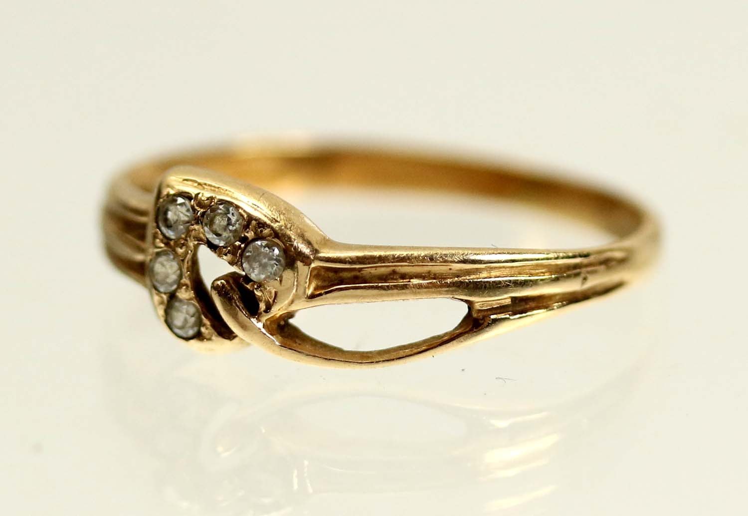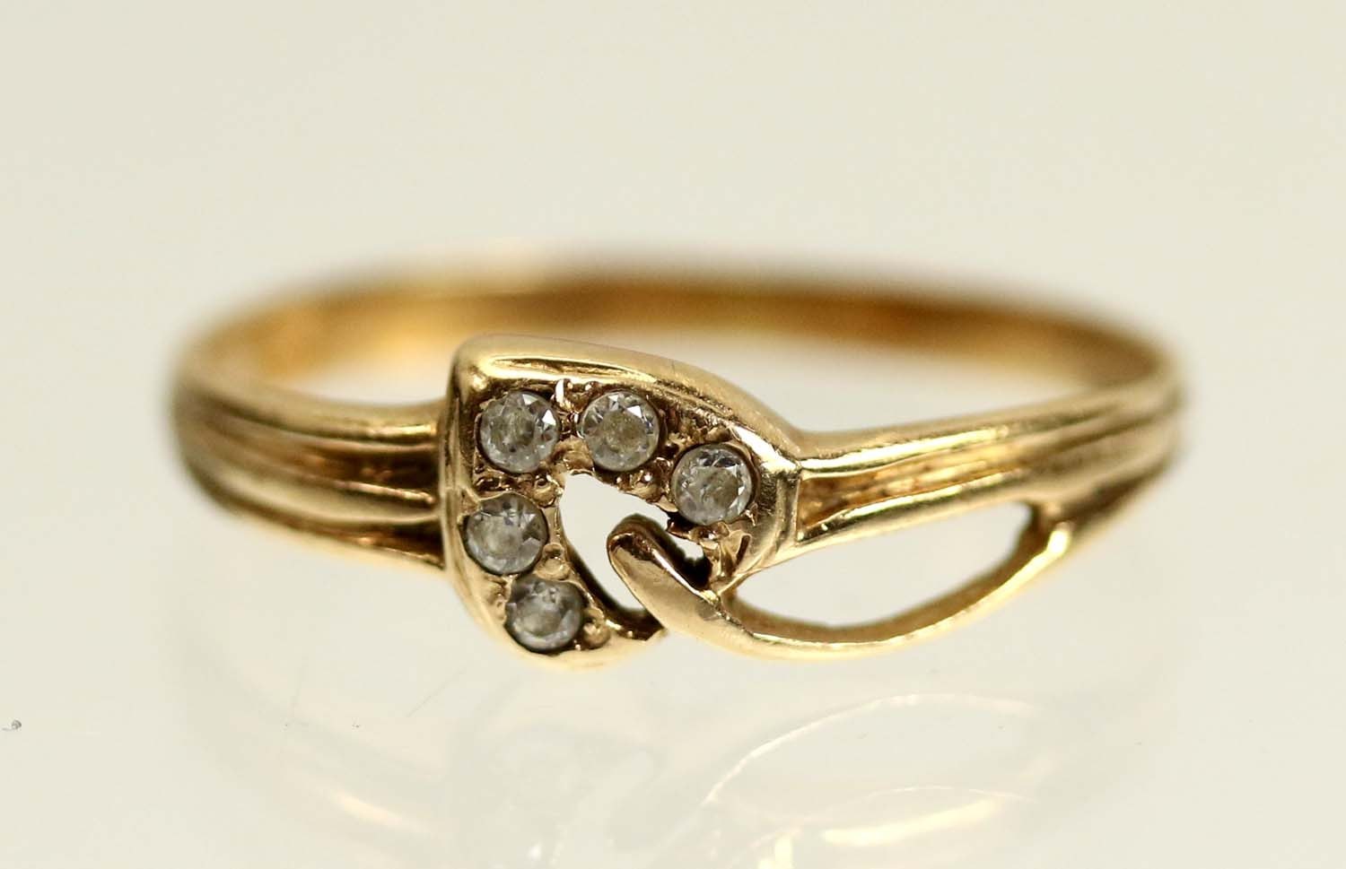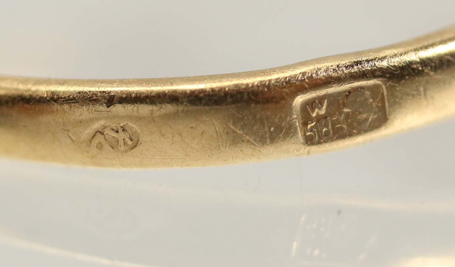 Pierścionek z cyrkoniami. Złoto, warszawska próba złota 583 po 1985 r., obok sygnatura wytwórcy K.D. Waga 1,53 g. Rozmiar pierścionka 17.