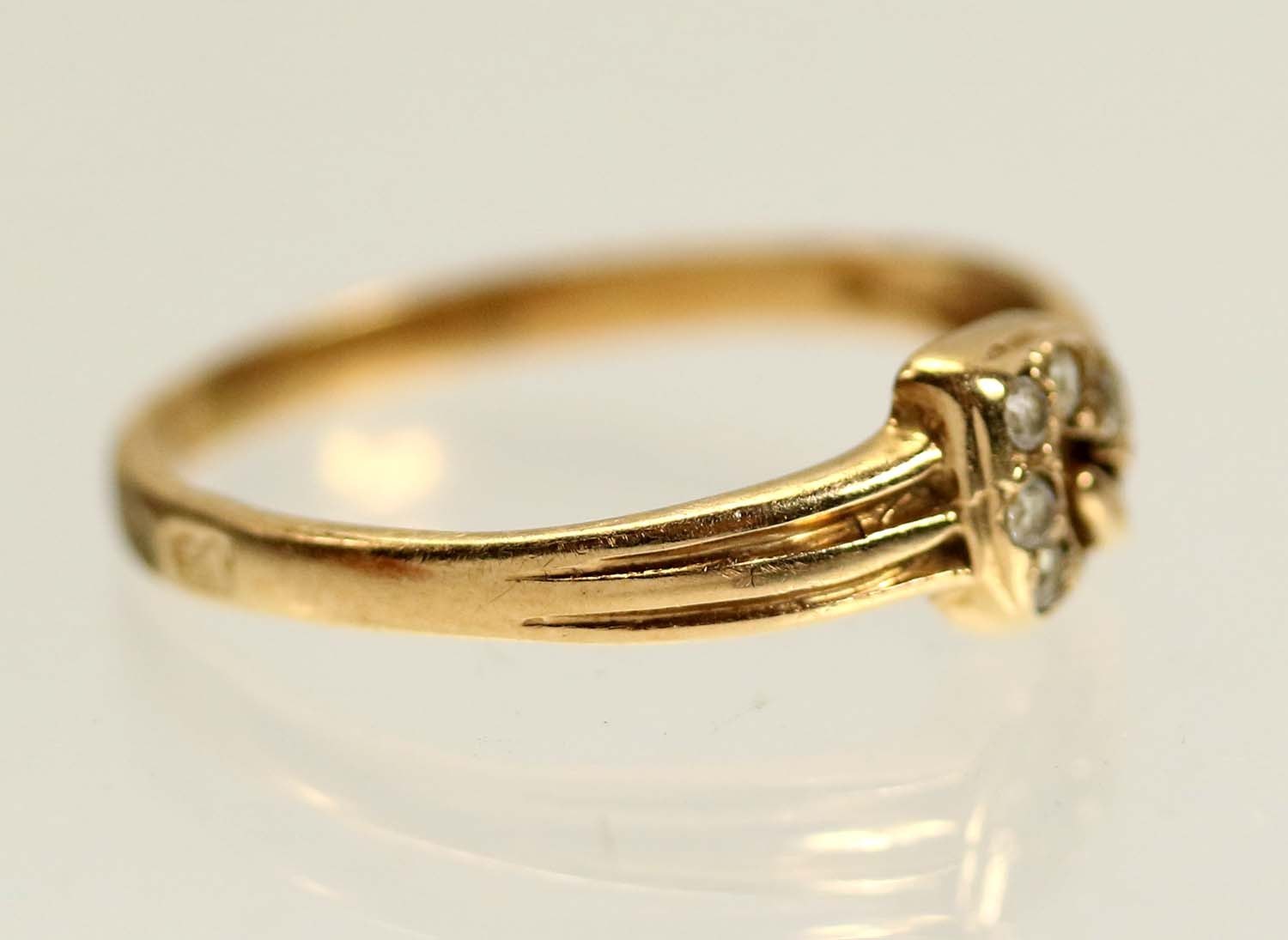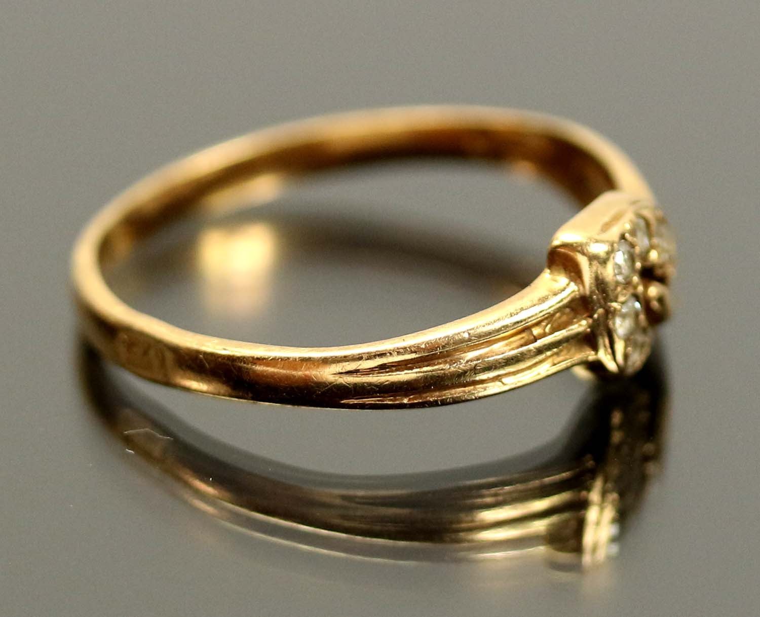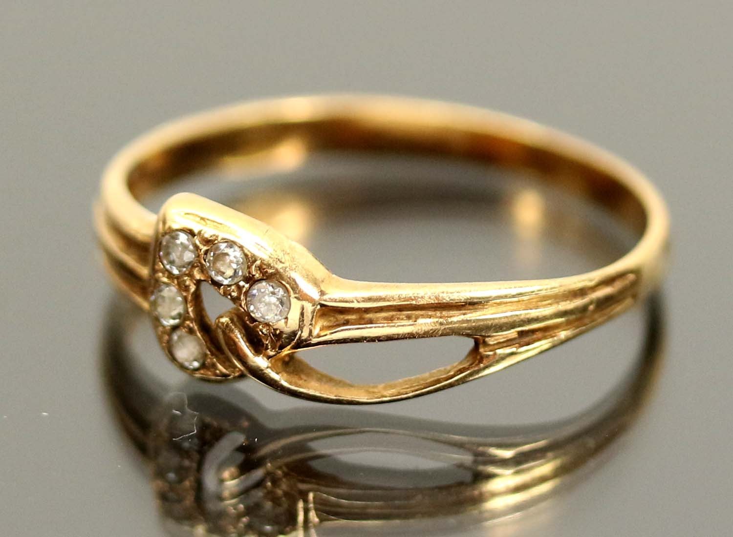 Pierścionek z cyrkoniami. Złoto, warszawska próba złota 583 po 1985 r., obok sygnatura wytwórcy K.D. Waga 1,53 g. Rozmiar pierścionka 17.