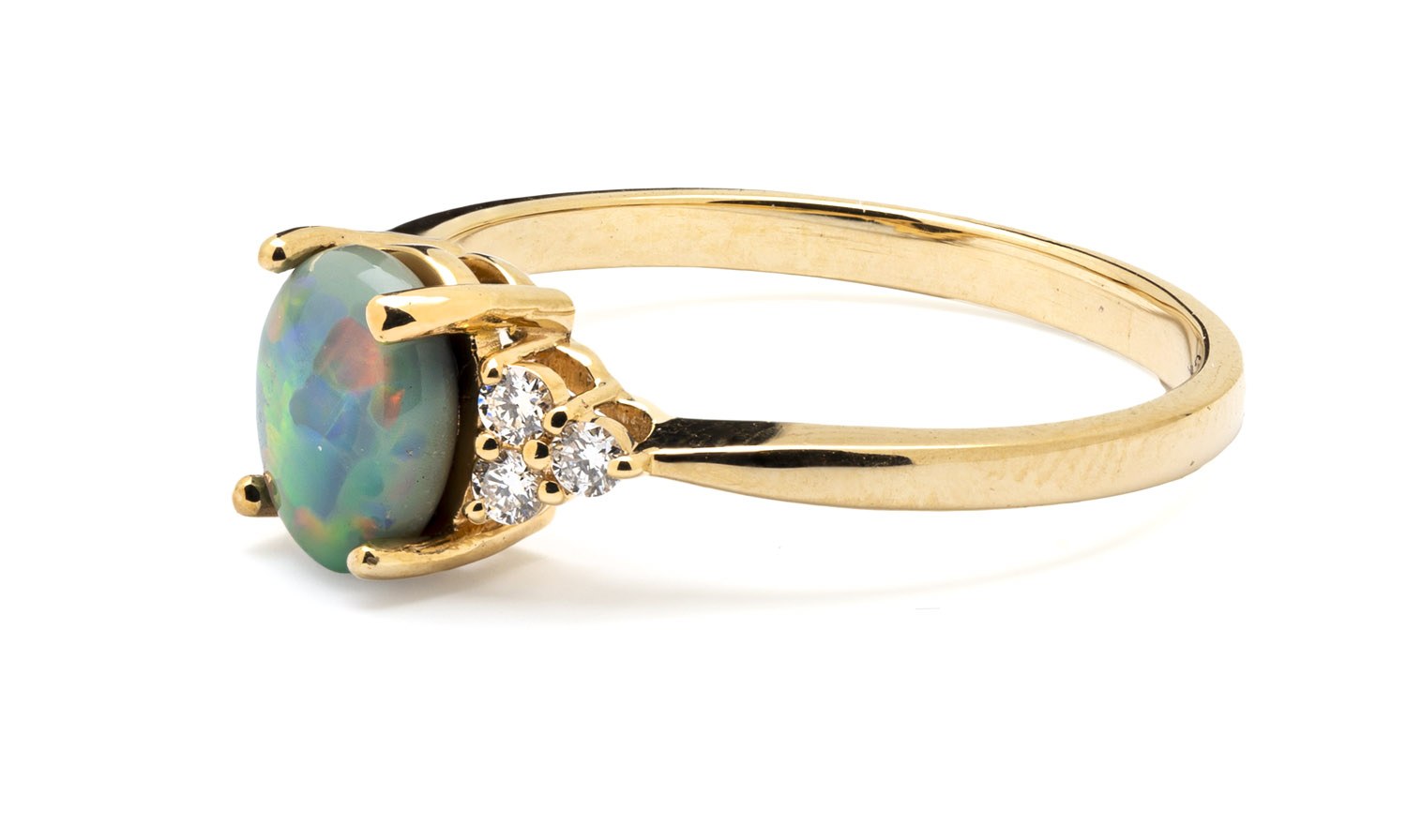 złoto pr. '3', 1 opal australijski 0,76 ct, 6 brylantów ł. 0,13 ct D-E/VVS-VS, krakowska punca probiercza, złotnik 'P.T' - Piotr Tomaszewski, masa: 2,35 g, rozmiar: 16*